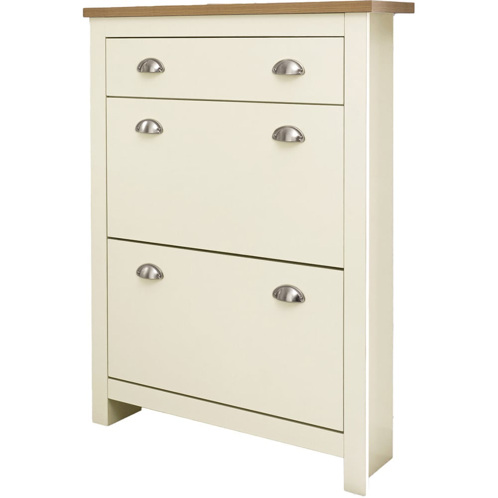 Keep your hallway free from clutter with this beautiful and practical GFW Lancaster Cream 2 tier shoe cabinet. With two compartments to store your footwear and a handy drawer for keys and more - it is ideal for any home. It features contrasting oak effect top with sleek, clean design. Dimensions: 24 x 78 x 108cm.
