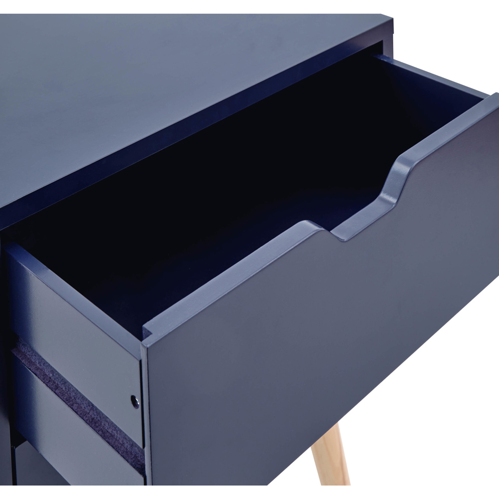 Spruce up your bedroom with GFW Nyborg Nightshadow Blue 2 Drawer Bedside Table. This Scandi-inspired unit makes a virtue out of simplicity. The classic cuboid form is just the right size to accommodate a lamp and a book or two, while the two handy drawers feature classic cut-out handles for simple yet effective operation. Mounted on pale-wood legs - it has cut out door pulls that futher accentuates the design. Dimensions: 30 x 40 x 56cm. Set of 2.