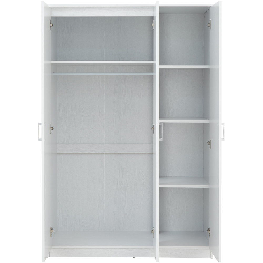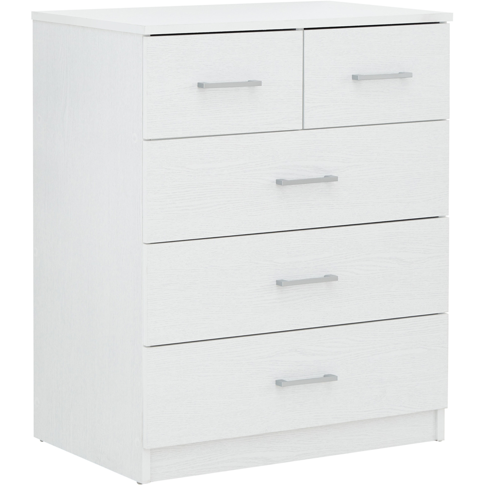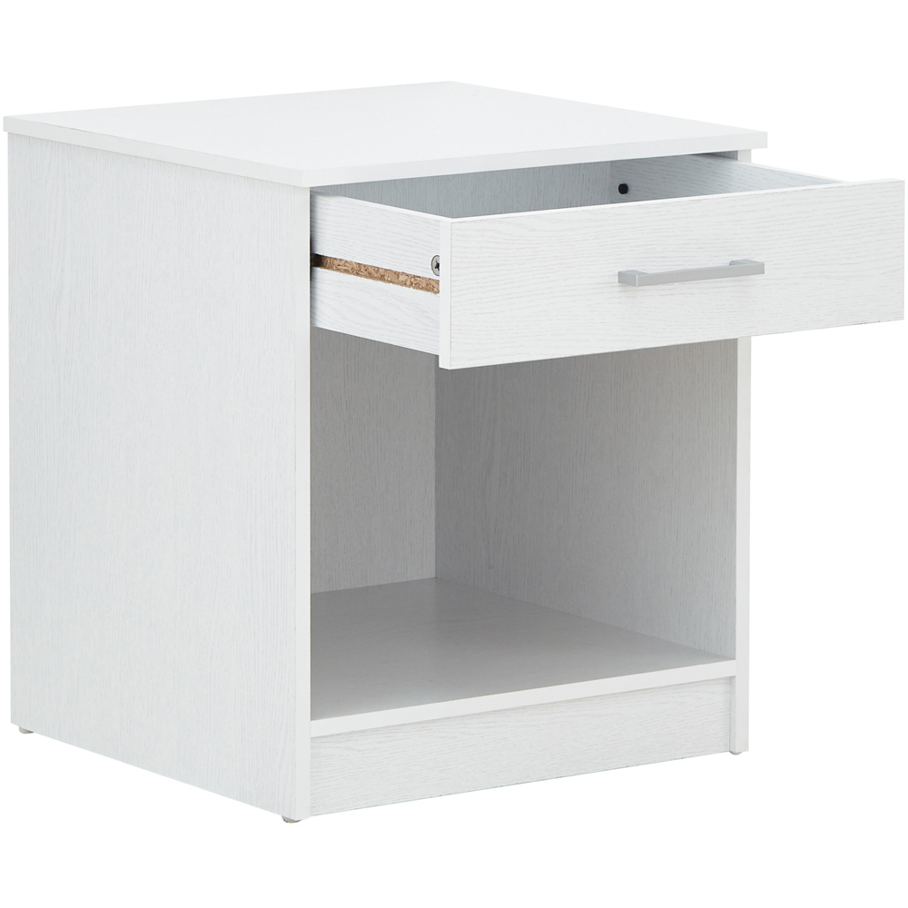 Explore modern living with this fantastic GFW Panama White 4 Piece Bedroom Furniture Set that perfectly balances style and function. Featuring a three-door wardrobe, a five-drawer chest, and two stylish lamp tables with both shelf and drawer storage, this set boasts clean lines and sleek satin handles for a contemporary appeal. It provides versatility to complement any room decor while ensuring you have ample hanging and flat storage. Dimensions: H48 x W40 x D39cm for each nightstand, H79.4 x W60 x D39.8cm for the chest, and H165 x W101 x D46.5cm for the wardrobe.