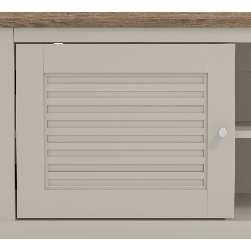 The GFW Salcombe 2 Door Light Grey TV Unit offers ample storage space to meet your entertainment needs. With three partitions, a centre shelf, and four roomy drawers, you can easily arrange your media devices, accessories, and more. Crafted from solid wood panels, it offers superior durability and stability, ensuring its longevity. The combination of engineered wood and a beautiful natural wood grain colour variation adds elegance to any living room, bedroom, or entertainment area. Its sleek design finish adds a touch of refinement to any space and complements any decor style, whether it's traditional, modern, or contemporary. This TV unit is not only beautiful but also functional, making it an essential addition to any home. It provides huge storage space with its roomy table top and cupboard, allowing you to store or display various items such as art, DVD players, and books.