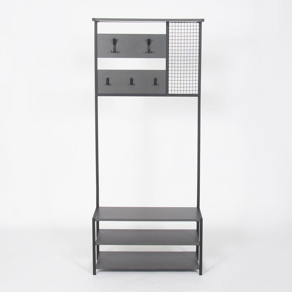 Make your hallway perfect with this GFW Shifnal 2 Shelf Dark Grey Hallway Storage Unit with Hooks. Its durable metal frame and details ensure longevity, while its dimensions are designed to fit any space. The unit helps keep everything organised with five hooks for coats, hats, and two shelves for shoes and boxes. It is crafted from high-quality engineered wood with a protective melamine finish. It is easy to maintain and clean, simply by using a damp cloth, with no need for chemicals. The unit is also easy to assemble, coming with clear instructions for a quick and enjoyable setup.