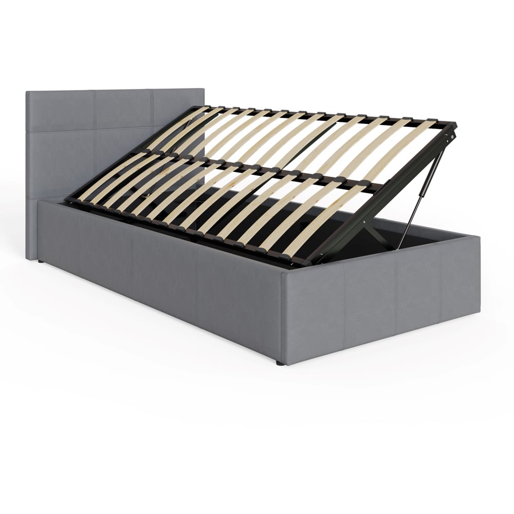 This stunning GFW Single Grey Side Lift Ottoman Storage Bed offers an attractive combination of contemporary style and ample storage space. This beautifully crafted frame is finished in high-quality faux leather and complemented by a simple yet stylish stitched headboard. This is an ideal solution if space is at a premium in your bedroom, as the ottoman base provides generous storage space for linen, blankets, towels or clothes. For ease of use, this stylish ottoman has colour-coded holes that allow you to assemble the ottoman to lift up from the side of your choice. The base lifts easily with the help of a gas hydraulic system so you can access the lined storage area underneath the bed.