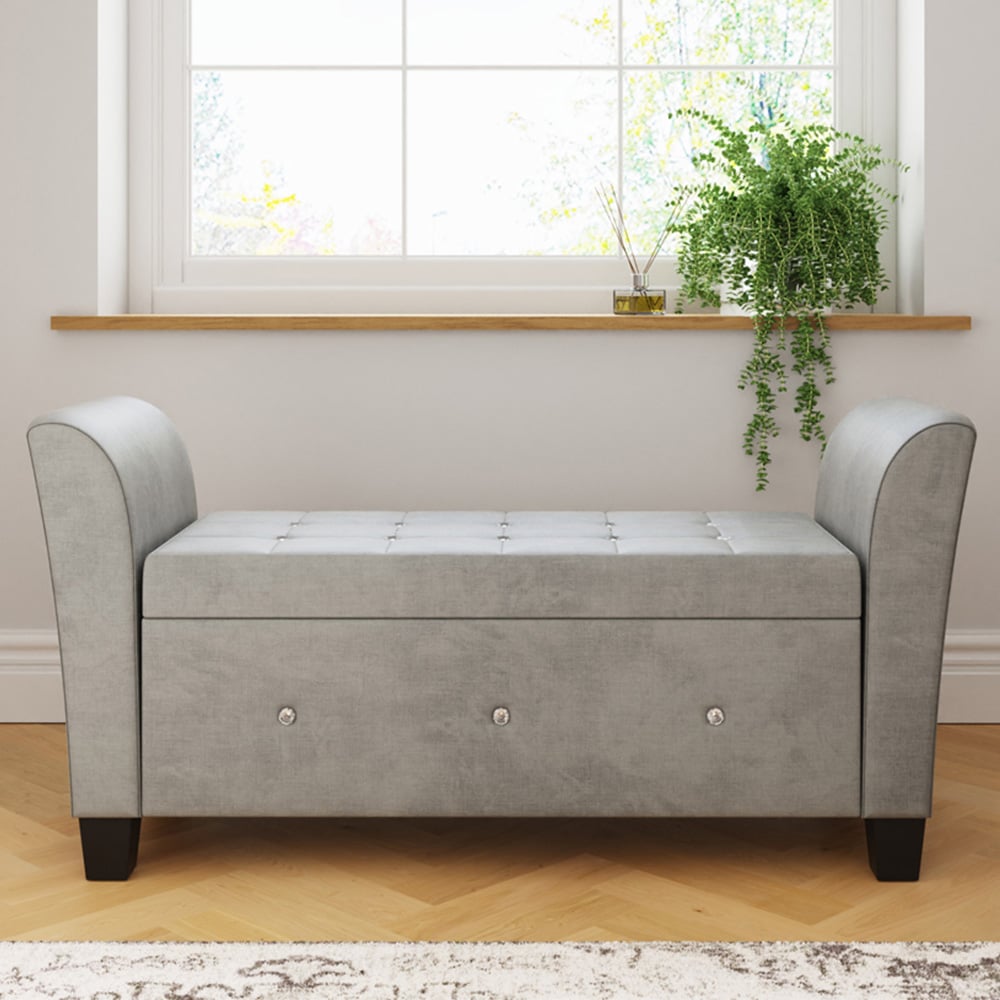 Refresh your living area with the GFW Verona Grey Diamante Window Seat, effortlessly merging traditional craftsmanship with modern convenience. Boasting deep buttoned detailing on its lift-up lid, and finished in soft chenille fabric, it offers an inviting seat perfect for smaller environments. The strong wooden feet provide reliable support, while its spacious hidden storage makes it easy to keep your home decluttered.