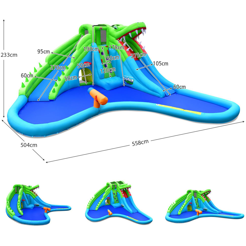 Encourage active outdoor play for your little one with the Costway Giant 7 in 1 Inflatable Bounce House with Air Blower. With double slides, a climbing wall, a basketball hoop, a splashing pool, easy-to-pass tunnel, this jumping castle allows your child to play a lot of games at the same time. By connecting the water hose, the slide with sprinkler sprays down on anyone for a cool feeling in summer. Also, the splashing pool with water cannons lets kids enjoy more water fun. Crafted from strictly selected material, the inflatable jumper is strong and durable for indoor and outdoor use. It can be placed in the living room, backyard and so on. Start your adventure with this multifunctional bounce house jumping park. This inflatable pool water slide can be used as a water park by connecting the water hose, which keeps your kids away from the sweltering summer. Kids can whizz down the slippery slide with a sprinkler into a refreshing splash pool. Besides, the direction of the water cannon is changeable for versatile use and extra fun. Made of high-strength Oxford fabric and PVC coating, the jumping castle with exquisite sewing features excellent tear resistance, and water resistance for longevity. The connecting area with a ventilated net protects the safety of children. Compared with ordinary slide handrails, this handrail is upgraded and heightened to give kids protection. This giant inflatable water castle takes only a few minutes to inflate by using a 780W air blower (Blower Included). You can store this compact bouncer in a carrying bag after deflating. It is suitable for outdoor and indoor, including living room, backyard, playground, parks, and more places. It can hold six children and can bear 150 kg when inflated (individual weight capacity: 45 kg). All required accessories and detailed instructions are included in the package. A pack of repair accessories (6 repair patches) for easy maintenance. Five ground stakes and four blower stakes are included for stable placement. A water pipe and a 780W blower for extra convenience and a carrying bag for easy transportation.
