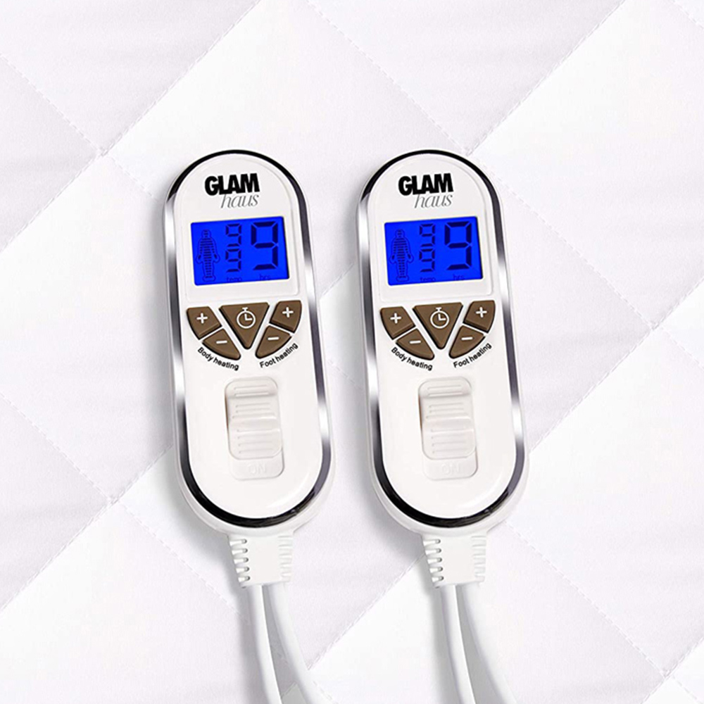 Make a perfect addition to your bed with this GlamHaus Double Fitted Electric Blanket. Every stitch in this blanket is made with impeccable attention to detail, giving you a perfect cosy partner. Featuring an extra-deep skirt, the electric blanket can be perfectly fitted on most mattresses. This fully fitted feature also prevents the blanket from creasing or riding up. With nine cosy heat settings to choose from, you’re always in control over your comfort. The top and bottom halves of the blanket are controlled independently, so you can set the feet and body temperatures independently. Apart from this, if you don’t want to run your electric blanket through the night, you can use the countdown timer to shut it off while you sleep. The blanket comes with nine hourly countdown timer settings, as well as a 12-hour low heat timer mode for perfect use. Thanks to the user-friendly digital controls that help you perfectly take advantage of the amazing features. Also, if you’re not comfortable with technology, the simple controller design and LCD helps you manage settings with just a few button presses. Easy to wash, just detach the power cord and run it on a short cold (or 30°C) wash for proper hygiene. Completely safe, the blanket is made to meet the highest quality and safety standards, and is fitted with an overheat protection system. Size: 193 x 137cm.