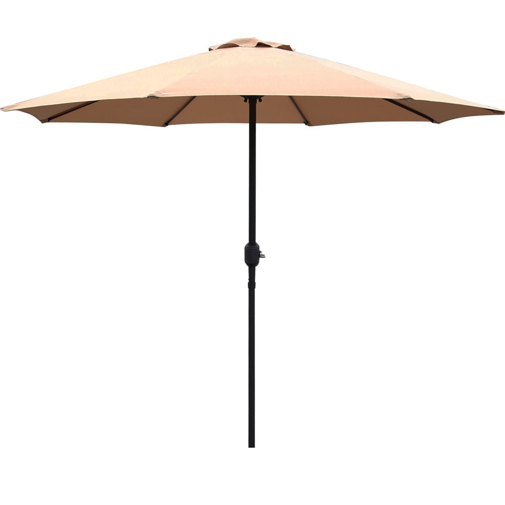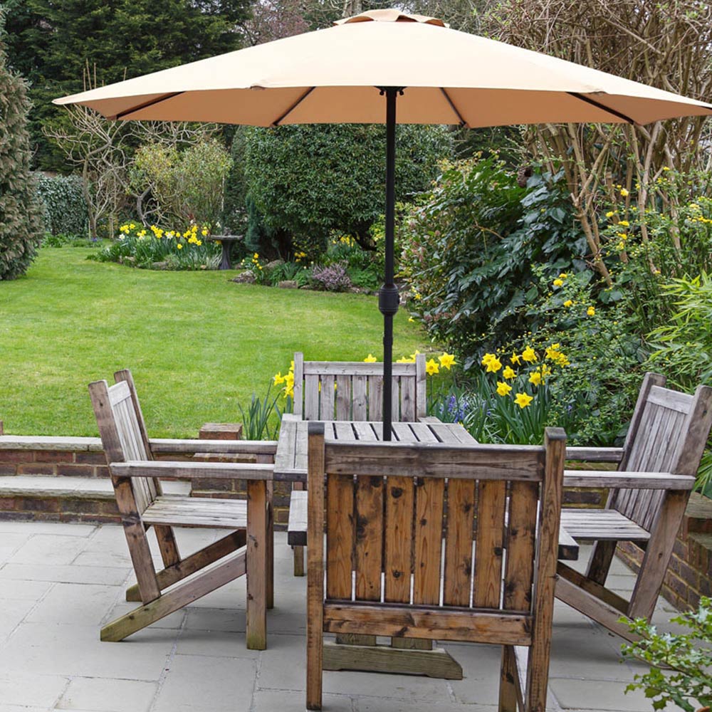 Create a blissful ambience in your garden with this GlamHaus Sand Garden Parasol with Crank Handle. The simple, stylish garden parasol is made from lightweight yet durable steel, and the fabric is 180G/M2 100% tear-resistant polyester fabric. It’s waterproof enough to withstand light rainfall and UV40+ resistant, hence won’t fade and disintegrate over time. The elegant design adds an understated sense of style to your seating area, making the whole garden appear extra-inviting and welcoming. The hand crank makes it easy and safe to open and close the parasol umbrella, and each parasol comes with a free protective cover to place the umbrella when not in use. Slot the two pieces of the pole together and set the parasol up in seconds with its no-fuss, minimal-assembly design. Dimensions: 2.7 x 2.35m. Looking for a way to keep your parasol secure and protected and enjoy some shade? Check out our selection of parasol bases, designed to keep your parasol in place while you relax and parasol cover to keep them protected.