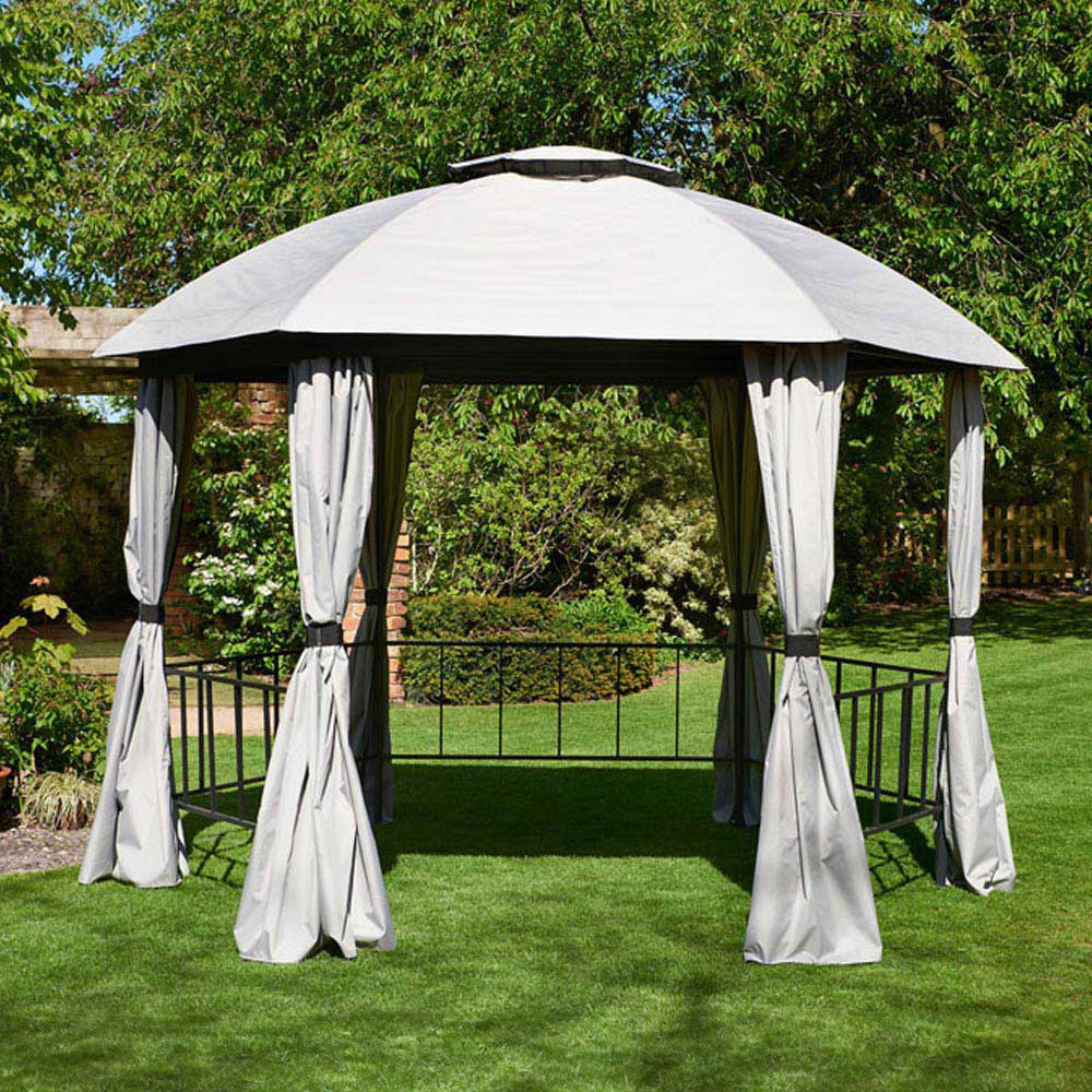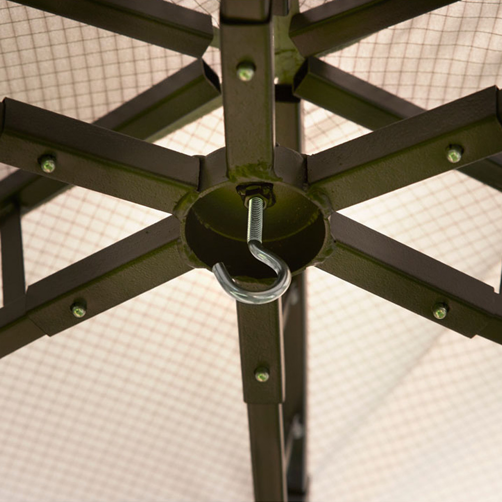 Host memorable late evening parties with this Glendale Big Hex Grey Garden Gazebo, a 3.5m diameter shelter suitable for large gardens and outdoor spaces. The gazebo with six support legs is designed to be strong and durable, constructed using a sturdy grey powder-coated steel frame to firmly secure it to the ground. A decorative metal frame connects the supports on five sides, creating a solid entrance/exit to the structure and an attractive barrier. Additionally, it is supplied with a full curtain and netting set, along with a central light hook installed in the roof canopy to add allure to your late night gatherings. Size: 1.75 x 1.75 x 1.75m.