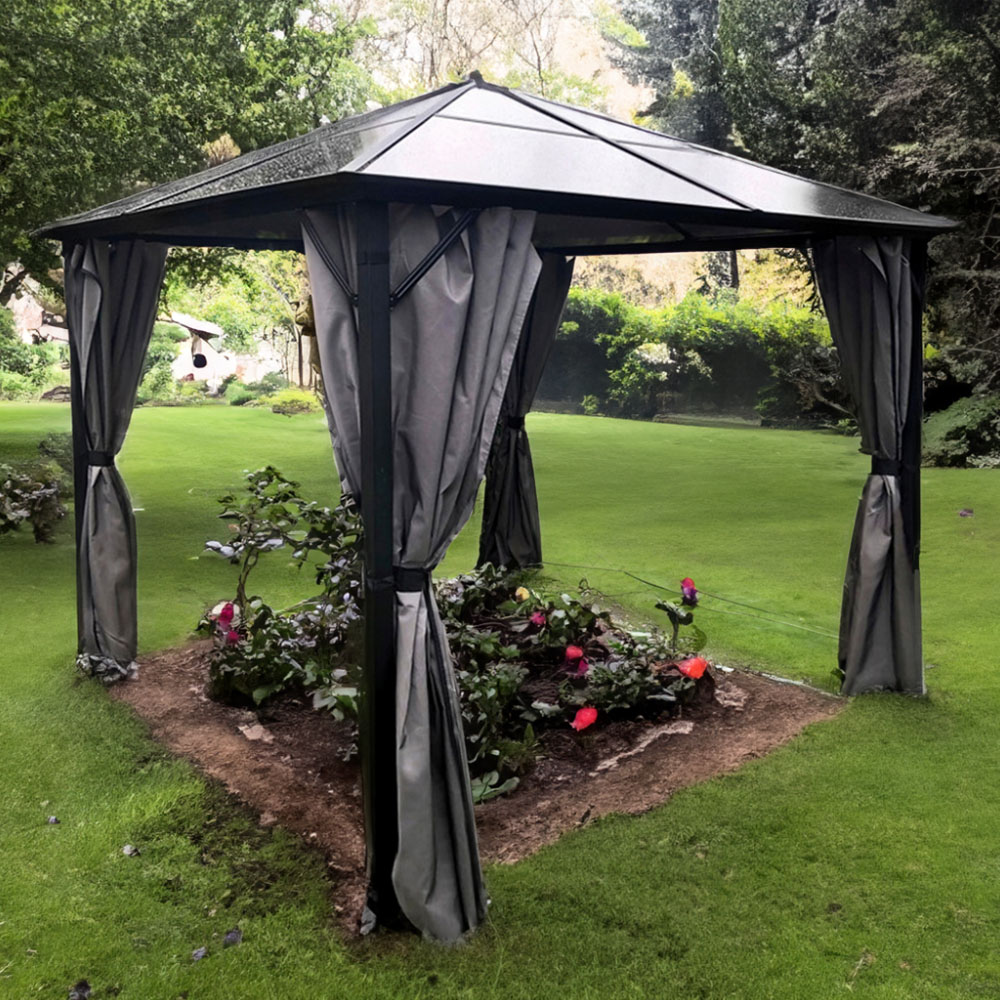 Make your garden the perfect hangout place with this Glendale Peninsula Polycarbonate Grey Garden Gazebo, an excellent permanent structure for your outdoor entertaining needs all year round. Features four powder-coated black steel columns that support the modern and robust polycarbonate apex roof on large, heavy-duty fixing plates with pre-drilled holes to ensure the legs can be secured and anchored to the ground for added strength and stability. Heavy duty, grey polyester curtains that are UV stabilised to prevent fading and are securely fastened to the frame by track for extra strength and can be easily removed for storage or cleaning. Additionally, the showerproof curtains include tie-backs and can be joined by simply zipping each side together for extra privacy and protection from the sun or breeze or to create a welcoming space. The sturdy construction is suitable for all weather and requires little or no maintenance. Two-person home assembly is required. Size: 4 x 3m.
