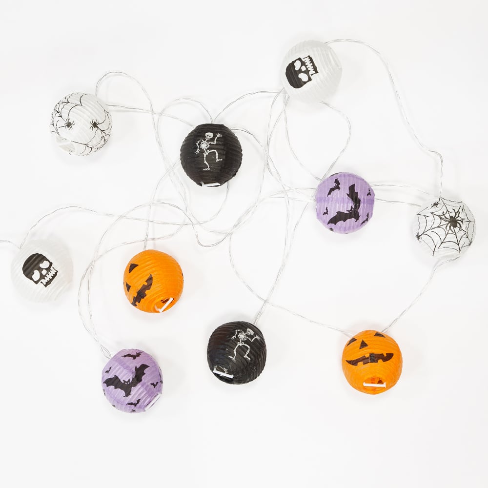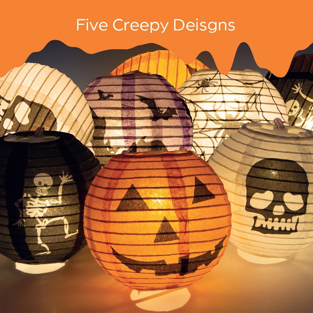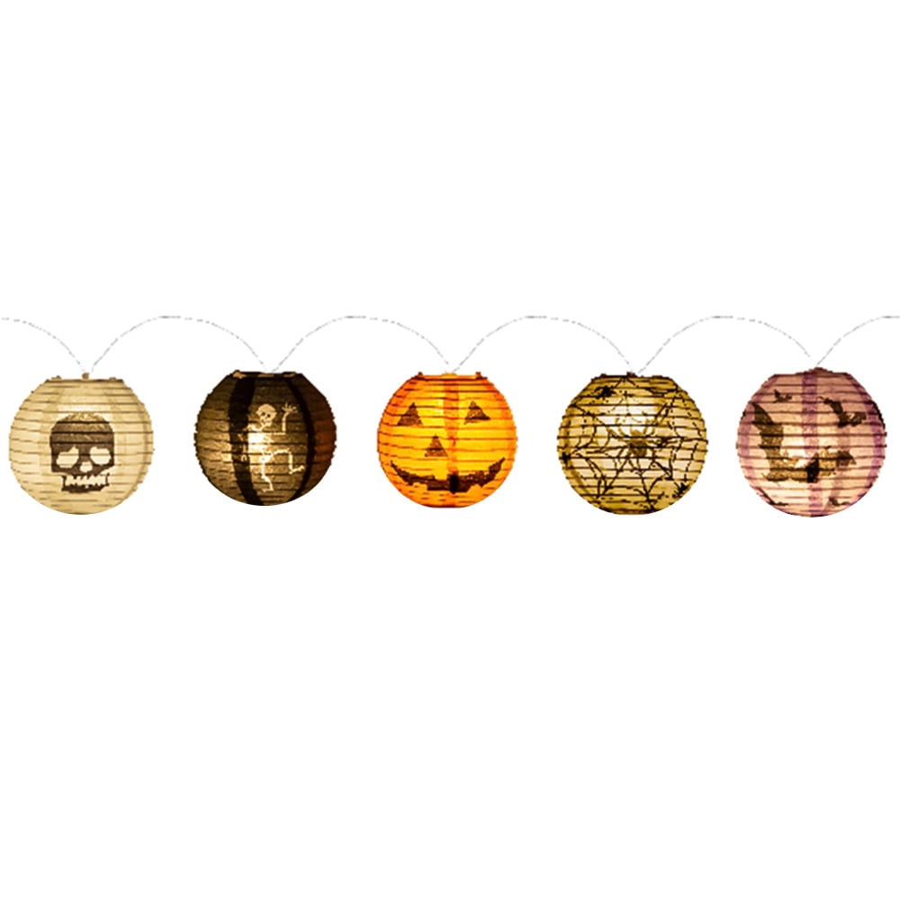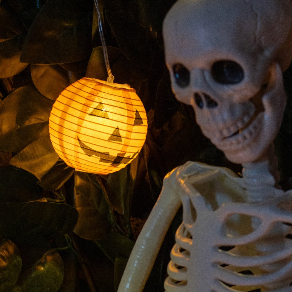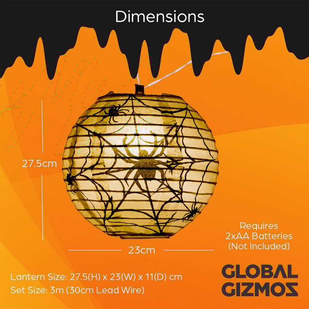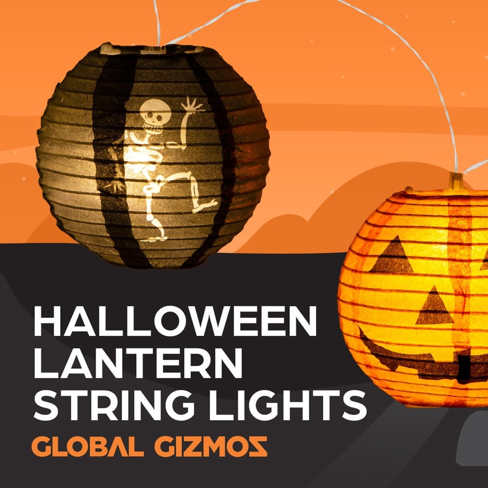 Get ready to create a spooky atmosphere for your Halloween festivities with the Global Gizmos Halloween Paper Lantern 10 LED String Lights 2m. These Halloween lights effortlessly combine sophistication with a haunting glow, making them perfect for any space you want to adorn. Each lantern features a unique print, including classic Halloween icons such as pumpkins, skulls, and spiders. The lanterns emit a warm white light and are powered by energy-efficient LEDs. This means the two x AA batteries (not included) required to power the lights will last for extended periods. When fully extended, the lights span a total length of three meters and can be easily folded back into a compact size for convenient storage. Because the lanterns are made of delicate paper and plastic material, please ensure that they are only used indoors.