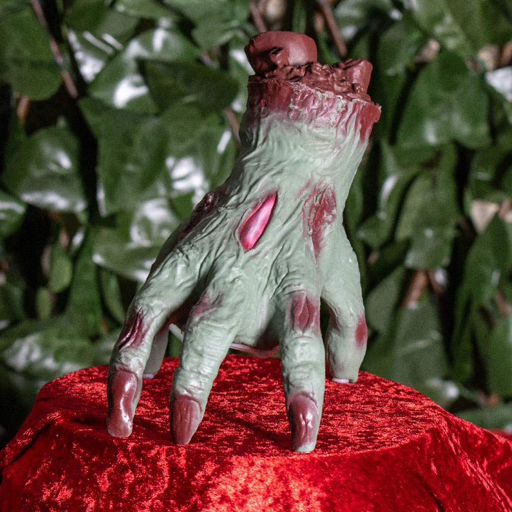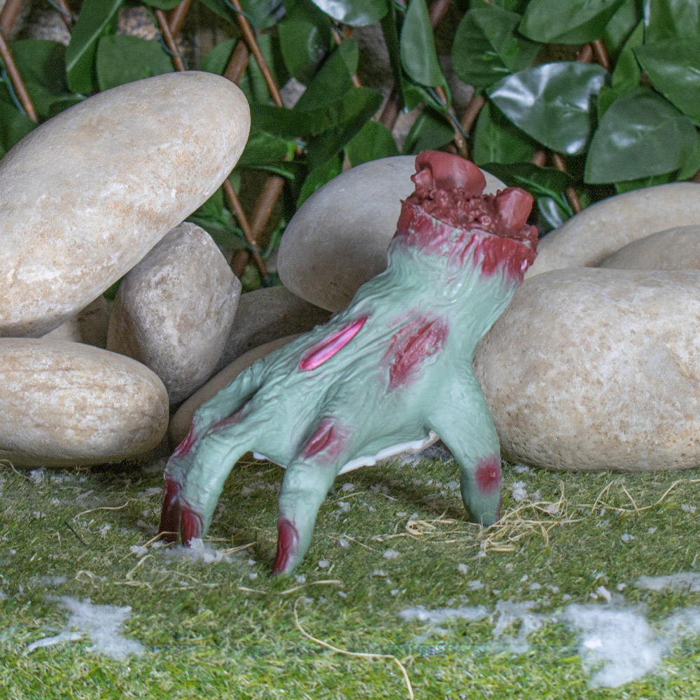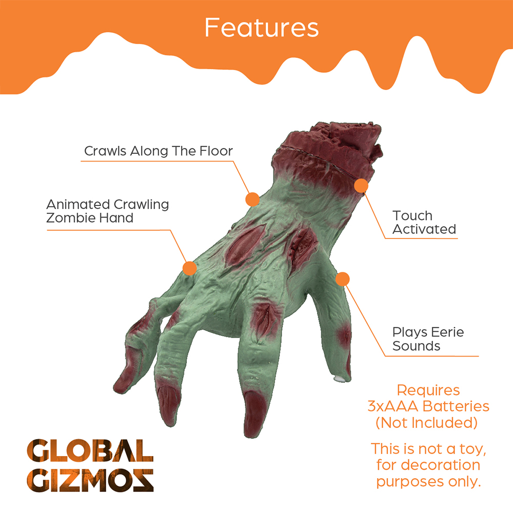 Make sure to grab the attention of your party guests with the Global Gizmos Animated Crawling Zombie Hand. This hand requires three AAA batteries (not included) to operate. It crawls forward independently, accompanied by a variety of creepy, eerie sounds for a multi-sensory Halloween experience. Once switched on at its base, the hand activates with a touch and works best on a solid flat surface such as a floor or table. Its detailed design includes rotting green skin, cuts, bruises, severed bones, and blood vessels, all of which contribute to a realistic and graphic appearance. Measuring H20 x W15 x D19cm, the hand is similar in size to a real adult human hand.