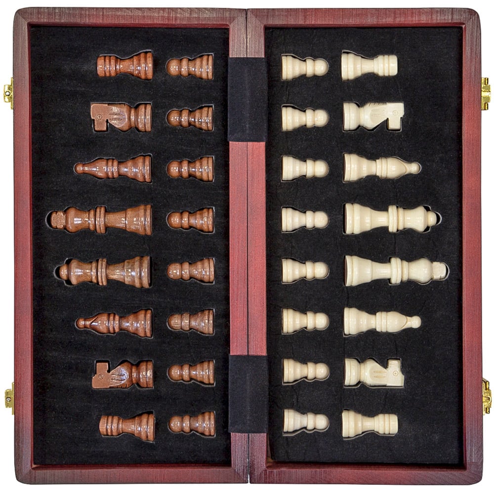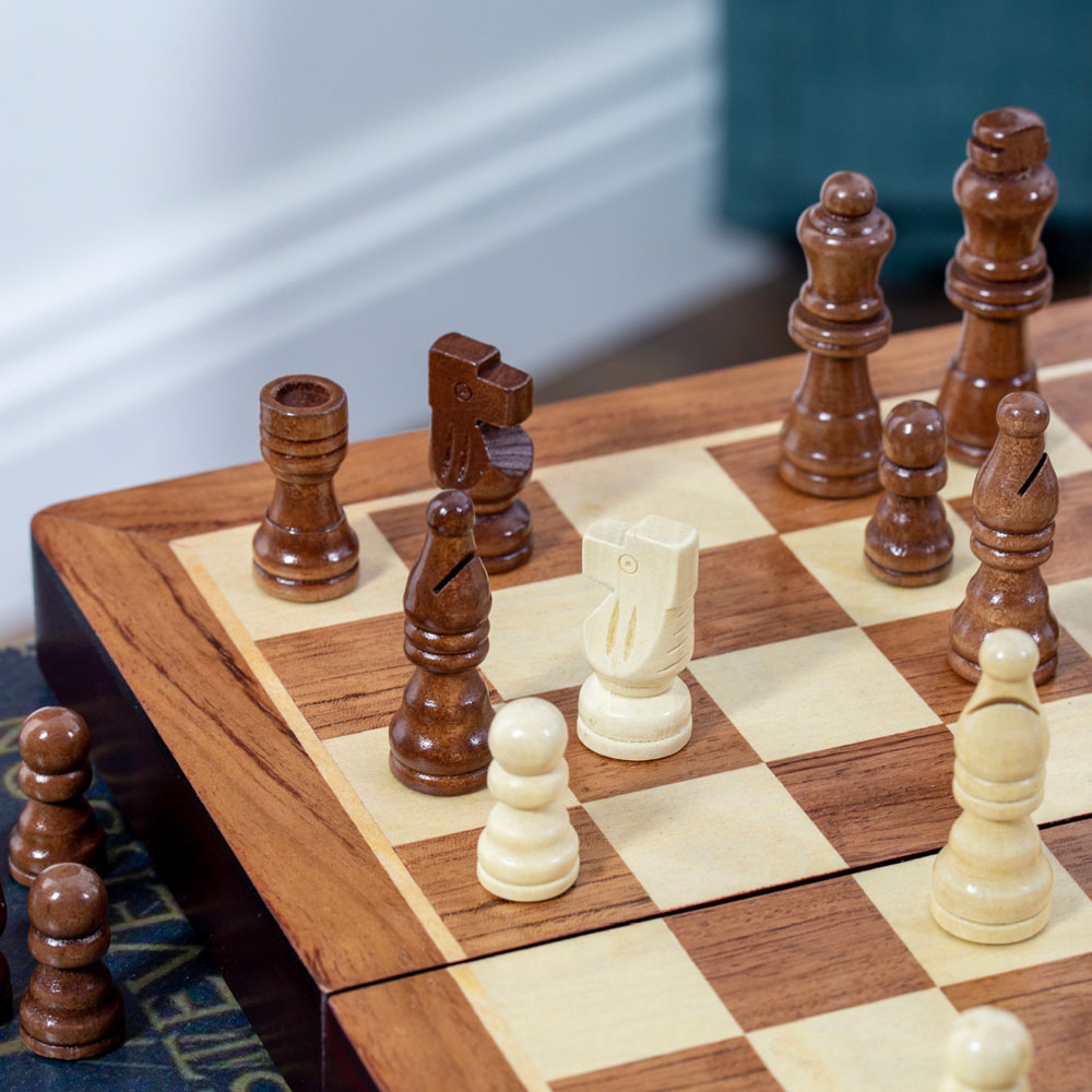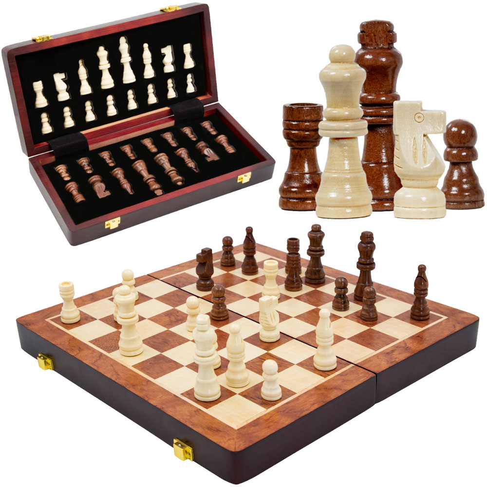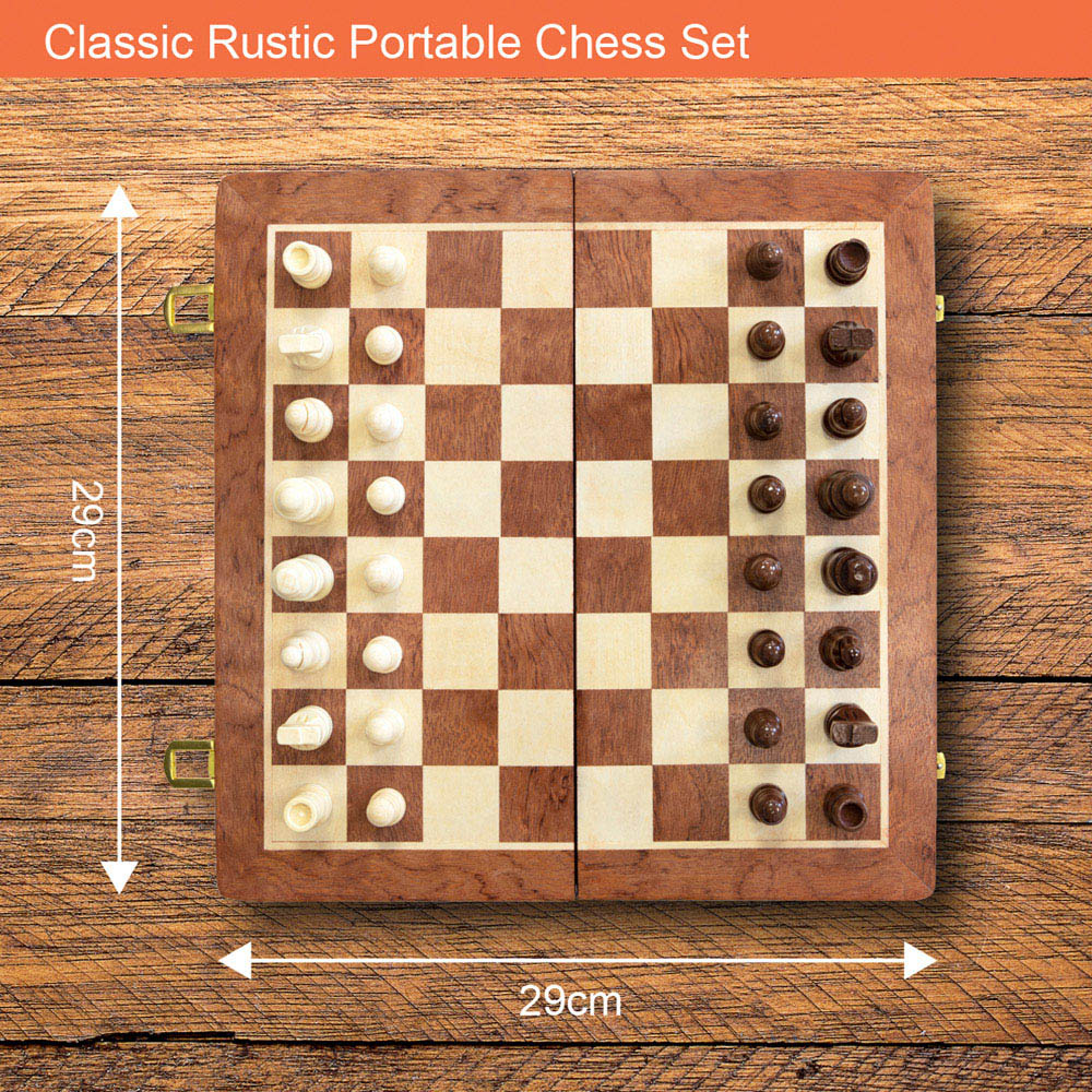 Stimulate your mind with a game of chess wherever you go with this Global Gizmos Foldable Wooden Chess Set! Featuring a full set of sleek chess pieces, this board can be securely folded over once you’re done playing, saving you space while also providing space inside to store all of the chess pieces in. Each piece has its own individually cut space within the felt material inside, preserving them nicely for any future games. The folding board locks together with clasps to ensure it securely stays together and reduces in size from 29 x 29cm to 29 x 14cm when folded. This makes the board ideal for travelling, as it can fit neatly in a bag to be used while on holiday. The board features a classy, rustic design thanks to the wooden material used, making sure that it’s full of traditional chess charm.