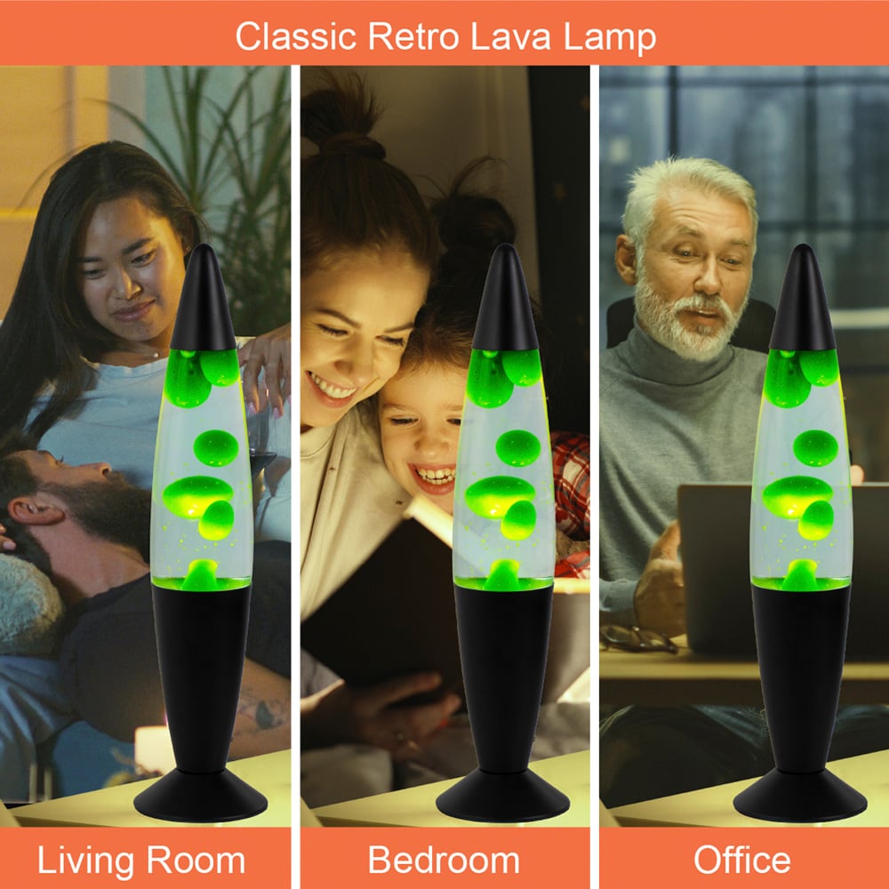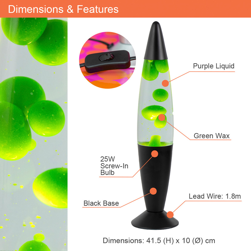 This Global Gizmos Green Wax Lava Lamp 16 inch is the perfect decoration for anyone looking to add quirky, retro character to their bedroom, living room, or any other part of their house! It combines the traditional lava lamp design with an exotic black & green colour scheme that goes well alongside neon lighting and gaming accessories. Standing at 16” tall, the lava lamp makes for an excellent focal point in a room or also works as a calming mood light on a table or desk. The cap and base of the lamp are made from aluminium, with the base’s circular shape providing balance and stability. The lamp is illuminated by an SES 25W screw-in bulb and is mains operated with a 1.65m cord.