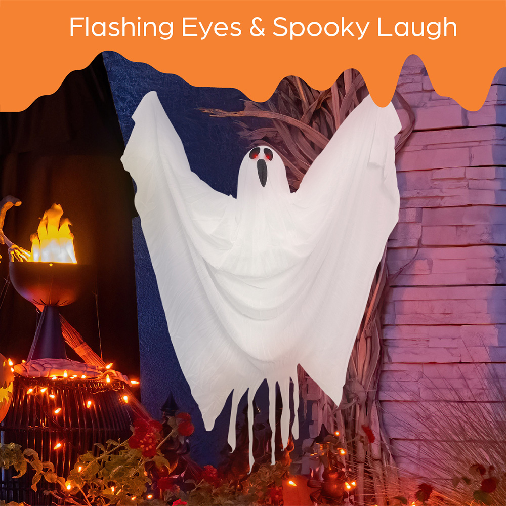 Add a spooky touch to your Halloween gatherings with the Global Gizmos Halloween Hanging Ghost. This interactive ghost decoration is guaranteed to create plenty of thrills and chills, thanks to its motion sensor-activated lights and sounds. As soon as someone walks by, the ghost's eyes will light up in a piercing red colour and it will emit the eerie sound of a ghostly laugh, providing the perfect element of surprise. Measuring 120cm tall by 70cm wide, the ghost features a steel wire frame that allows you to adjust its arms up and down to enhance its spooky appearance. It's easy to hang with the included tie on the top and is powered by LR44 button cell batteries, which can be replaced.