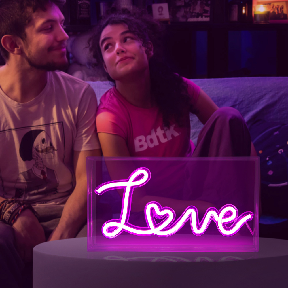 Add quirky, retro character to their home with this Global Gizmos Love Acrylic Box Neon Light. The neon light glows in a pattern showing the word “Love”, written in a smooth cursive style, and featuring a heart in place of the letter “o” for that extra magical romantic touch. The acrylic box surrounding the light measures 12.5cm high by 23cm wide. Fitting perfectly with the ‘love’ theme of the light, the LEDs within the acrylic box glow in a vibrant, yet soothing pink colour. This makes the light perfect for creating and maintaining a relaxed atmosphere in whatever room you choose to place it. This LED light is powered via a USB plug-in cable, making it suitable for being powered via wall sockets, as well as computers, laptops, and portable chargers. The cable provided is two metres in length, giving you ample space to place the light away from its power source.