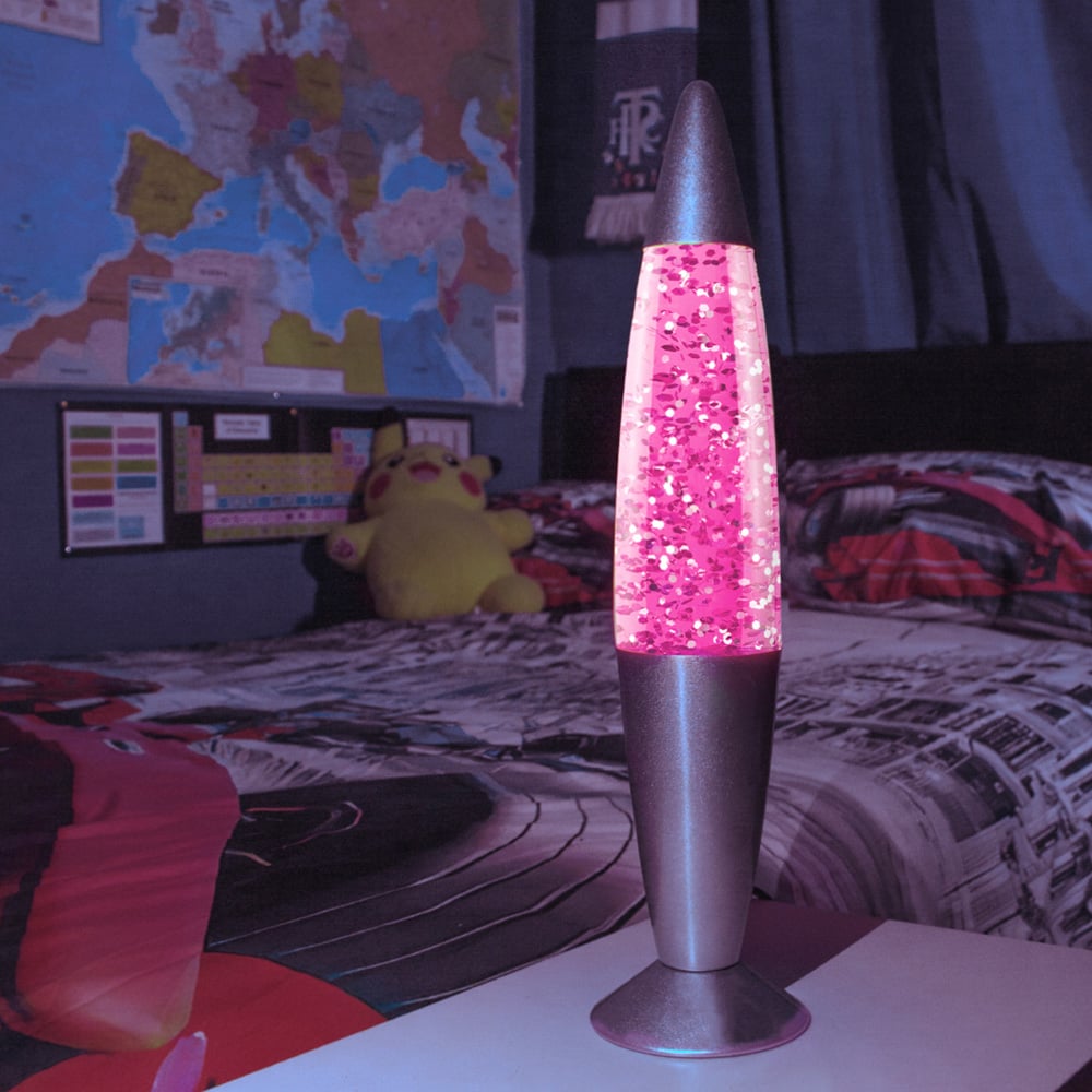 This Global Gizmos Pink Glitter Lava Lamp 16 inch will provide a nostalgic & retro look and feel to your home, kids’ bedroom or office spaces. This lava lamp features sparkly glitter inside a vibrant pink liquid, giving it a unique look & feel, as well as giving off a futuristic & unique finish. This lava lamp is an impressive 16 inches tall, making it stand out and provide a clear focal point and mesmerising glow in any room it’s placed in. This lava lamp comes with a SES 25W screw-in bulb which provides the warming glow within the tube. The base of the lava lamp is manufactured from aluminium and keeps it anchored in position.