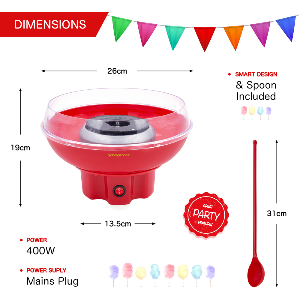Bring the fun of the fair to your home with this easy-to-use Global Gizmos Red 26cm Candy Floss Maker. Perfect for making a delicious sweet treat, it allows you to whip up delicious candy floss in no time. Its simple operation means you can enjoy your sugary delights quickly and effortlessly. Measuring 26cm x 19cm with 400W of power, it is not only fun to use but easy to clean and store. Its convenient size makes it a great addition to any occasion, bringing joy to kids and adults alike.