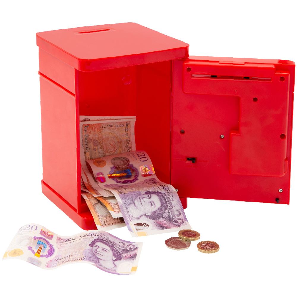 Secure your savings in style with this fun and functional Global Gizmos Red ATM Money Box 19cm. Ideal for teaching kids about saving, it features a passcode system to keep your coins and notes safe and sound. Powered by three AA batteries that are not included, it comes with a default password that you can easily change for your own added security. It also includes lights and sounds, enhancing the experience of saving money. With a compact size of 19cm x 13.5cm x 12cm, it's perfect for storing your funds in a discreet, secure location.
