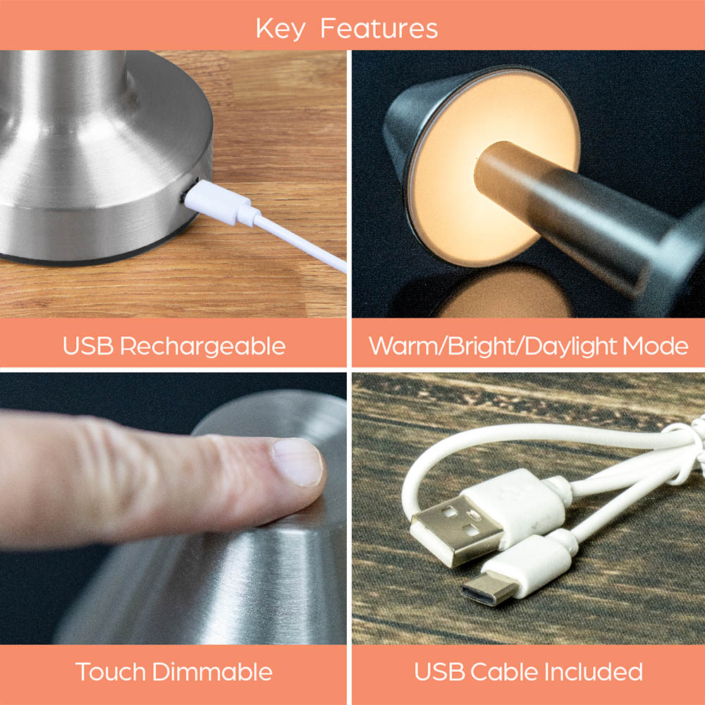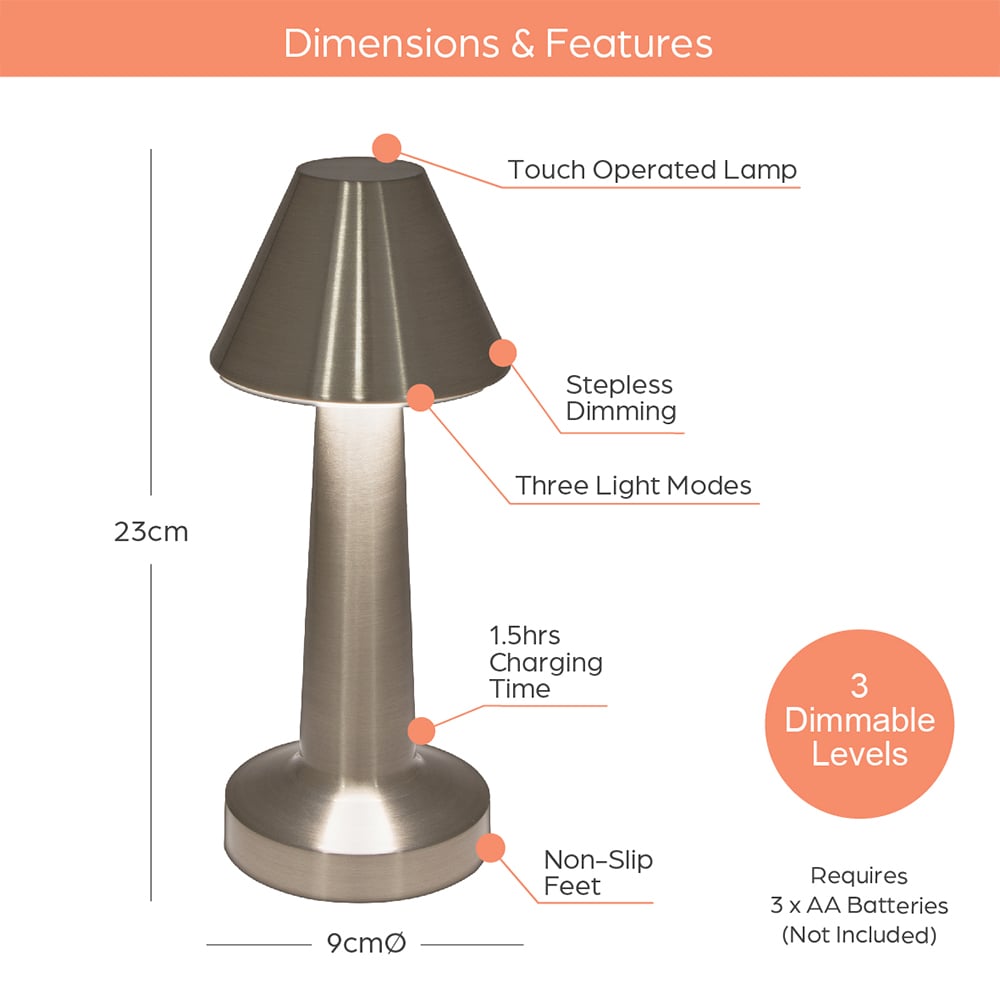 It features a slender base, with a wider shade on top that casts out a warm white light to its surroundings. This modern LED table lamp will provide a calming glow for any space it is used in. With its minimalist, cordless design featuring a metallic silver colour and the shape of a traditional lamp, the lamp can add character and convenience to a variety of different rooms. The light, which glows in a white colour, features the use of energy-saving LEDs, ensuring one charge lasts for a long period of use. The lamp is charged via the included USB cable, and can also be used while on charge. With convenience in mind, the lamp is turned on by the simplest of methods – simply touch the top of the lamp to turn it on. Further touches will allow you to cycle between 3 different levels of dimming, perfect for when you’re settling down for the night.