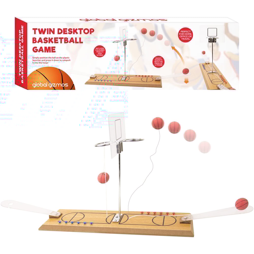 Easy to set up and super fun to play, this Global Gizmos Twin Desktop Basketball Game is great for children and adults alike. All you need to do is place the ball on the plastic holder, hold it down and let it go! The aim of the game is to sink six baskets before your opponent does. As the balls are on string it stops them getting lost and helps keep the game fast-paced as you can set it back up quickly. Size: 35 x 25cm.