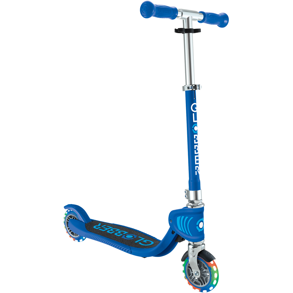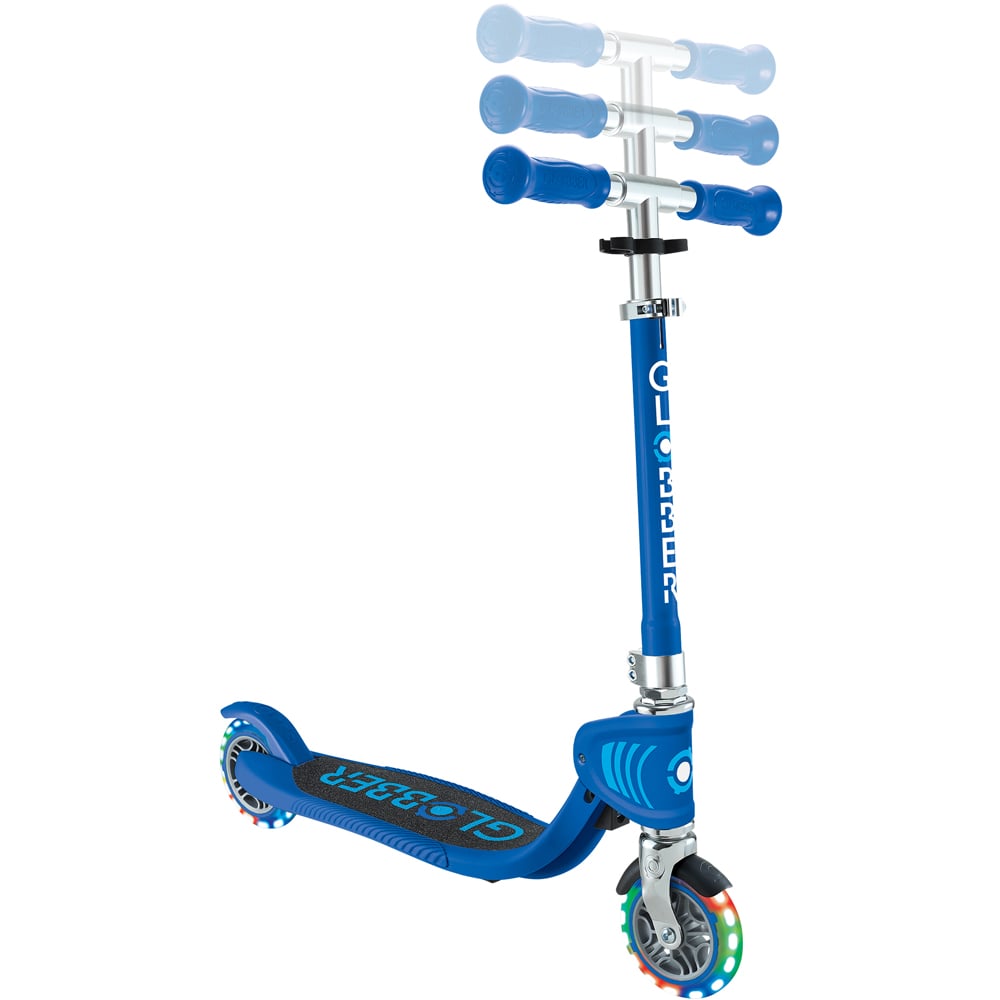 Surprise your little ones with the Globber Flow Navy Blue Foldable Scooter with LED Light, designed to help young riders transition from three-wheeled scooters to two-wheeled ones. It boasts a robust and durable design, making it the perfect option for kids. The battery-free LED light-up wheels, which flash green, blue, and red, are not only of the highest quality but are also protected by integrated mudguards and metal rear brakes for added safety. The scooter comes with a three-height adjustable T-bar, making it suitable for kids aged three and up. The durable and ergonomic grips ensure maximum comfort during rides. The scooter is easy to store and transport in its folded mode thanks to the integrated folding system with a safe side push button. Additionally, the robust reinforced structured deck is complete with anti-slip grip tape and can support weights of up to 50kg, ensuring a stable and safe ride for your child.