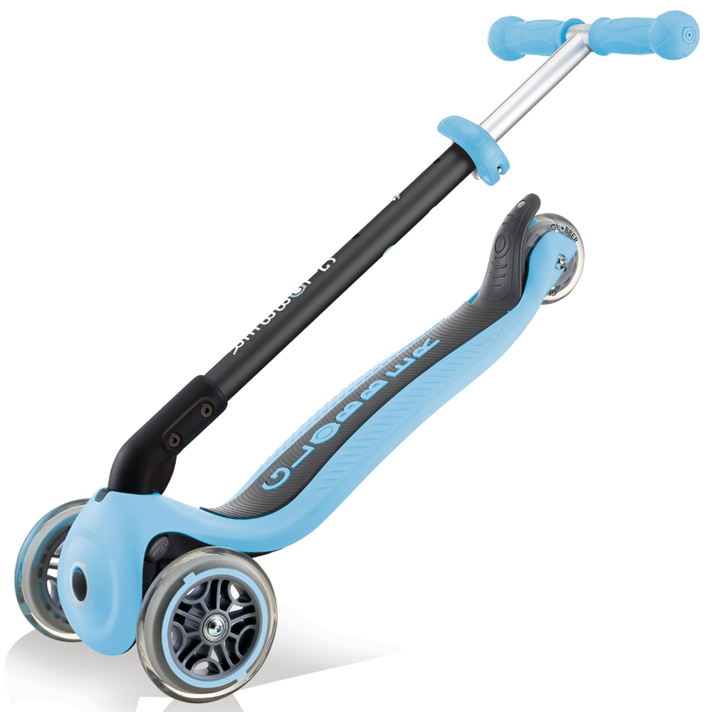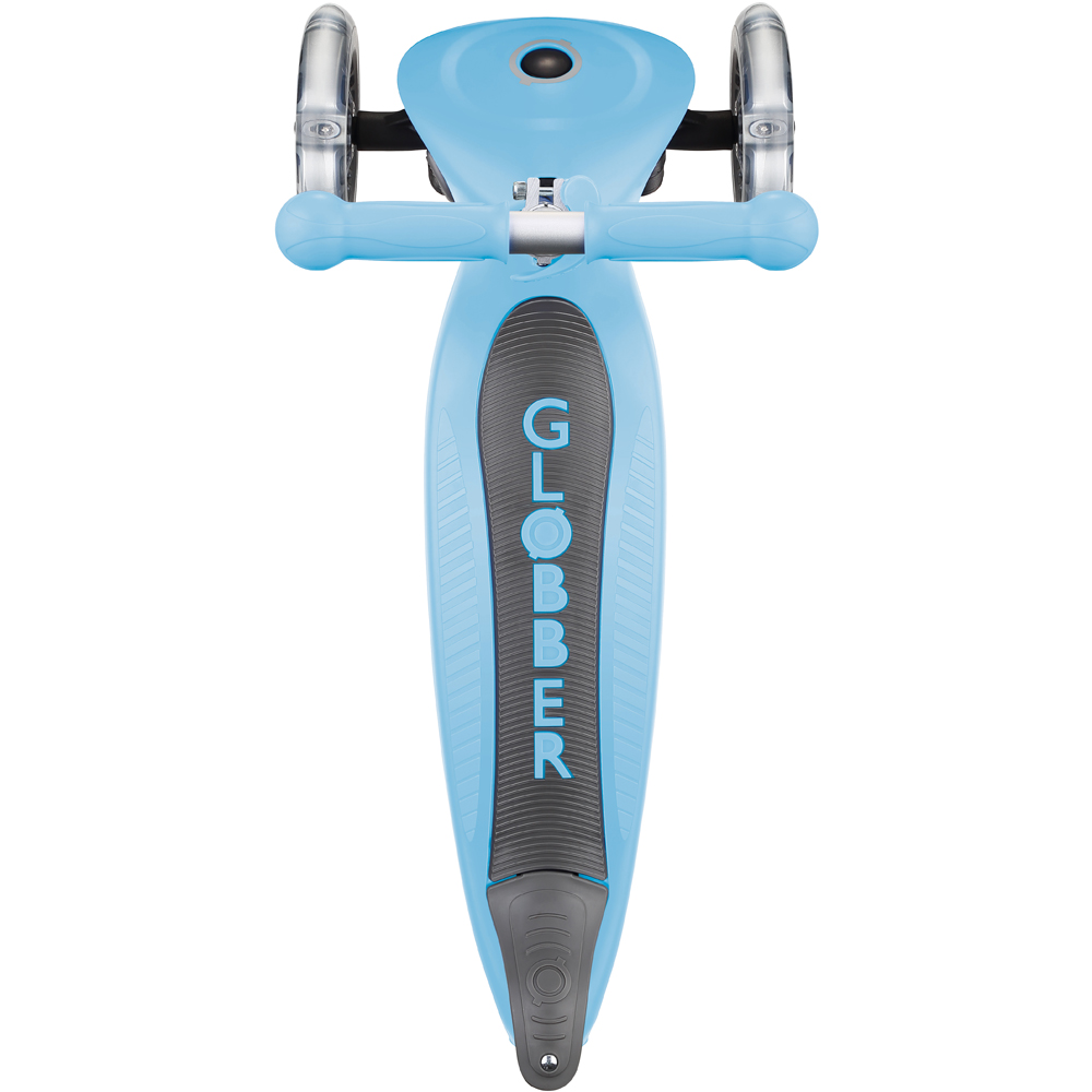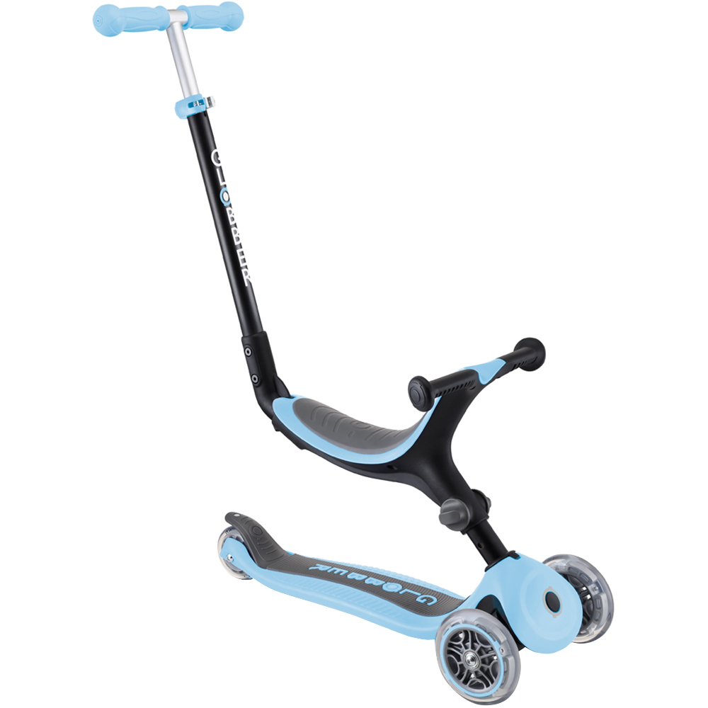 Surprise your little ones with the Globber Go Up Pastel Blue Foldable Scooter, a versatile and innovative scooter designed to grow with your child. With its ability to transform into three different forms, a ride-on pushchair, a walking bike, and a traditional scooter, this three-wheeled marvel offers flexibility and functionality. Its push-button mechanism allows for easy folding into trolley mode, making transport and storage a breeze. The patented steering lock button ensures safety by fixing the steering system of the two front wheels, allowing only forward and backward movement. Additionally, the extra-long and wide composite rear brakes provide excellent brake efficiency and prolong wheel longevity. The adjustable three-height metal T-bar ensures that the scooter can adapt as your child grows, and the ergonomic TPR grips and soft seat ensure both comfort and durability.