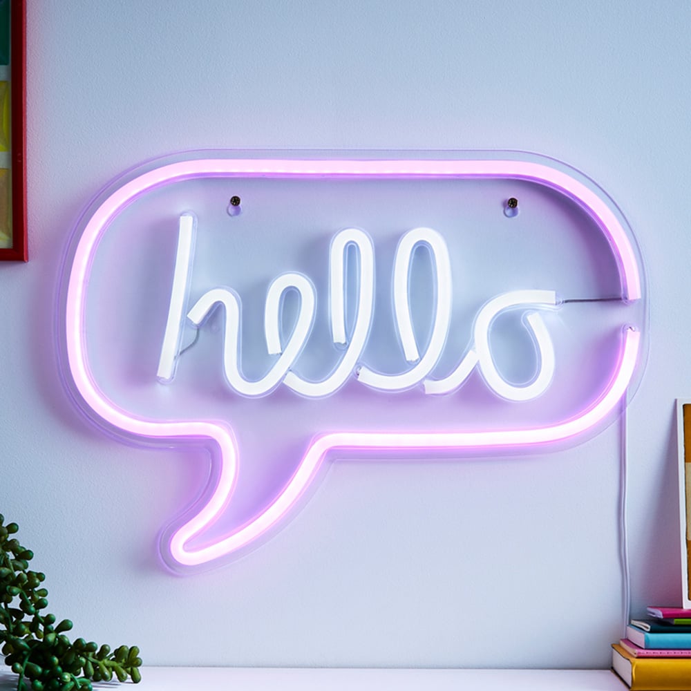 Brighten up your space with a pop of colour and fun with the GLOW HELLO Speech Bubble Neon LED Wall Light in pink! This bold and playful design features a glowing neon-style speech bubble with the word “HELLO” in bright, eye-catching LED lights. It’s the perfect way to add personality and modern charm to any room.