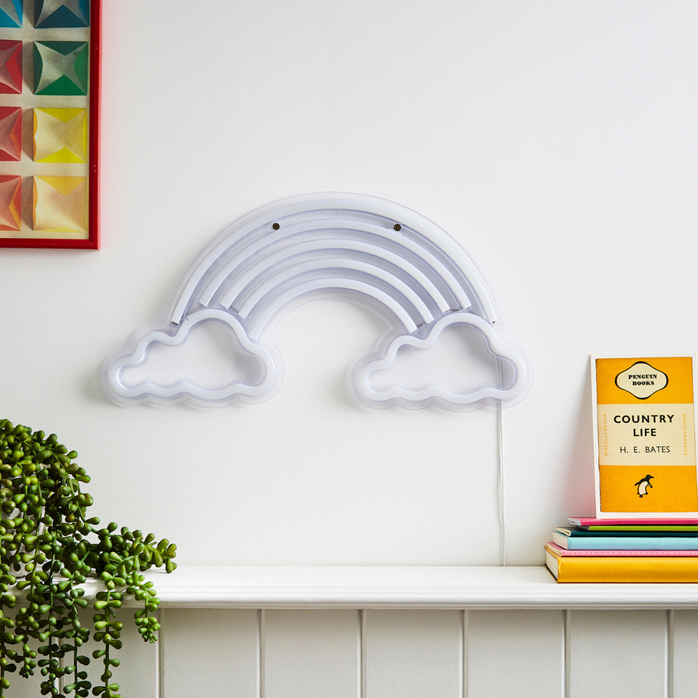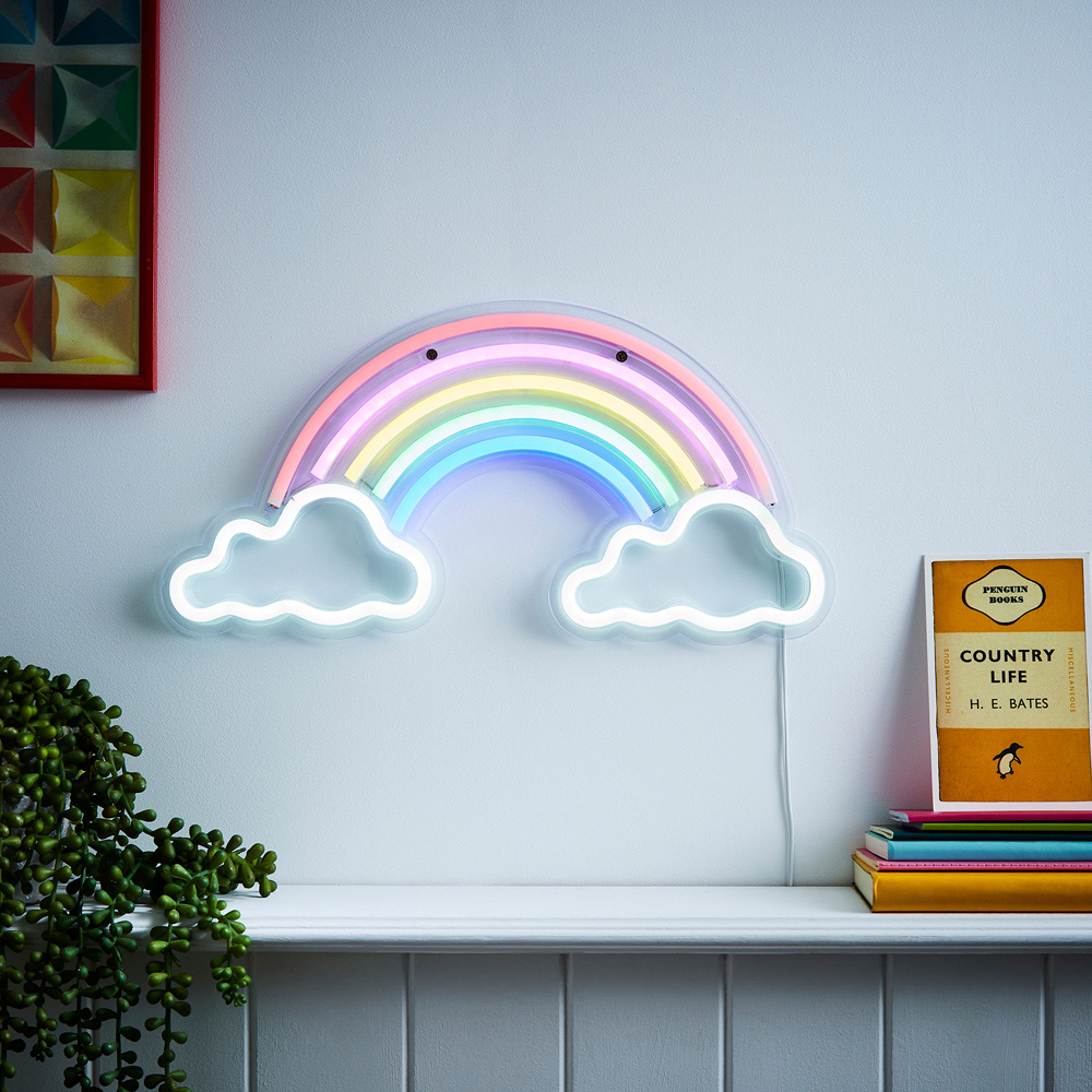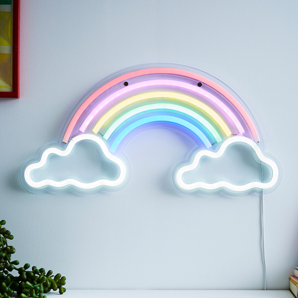 Bring a burst of colour and joy to any room with the GLOW RAINBOW & CLOUDS LED NEON Wall Light! This cheerful design features a vibrant rainbow arching over soft, fluffy clouds, glowing with colourful LED neon lights that create a dreamy, enchanting atmosphere.