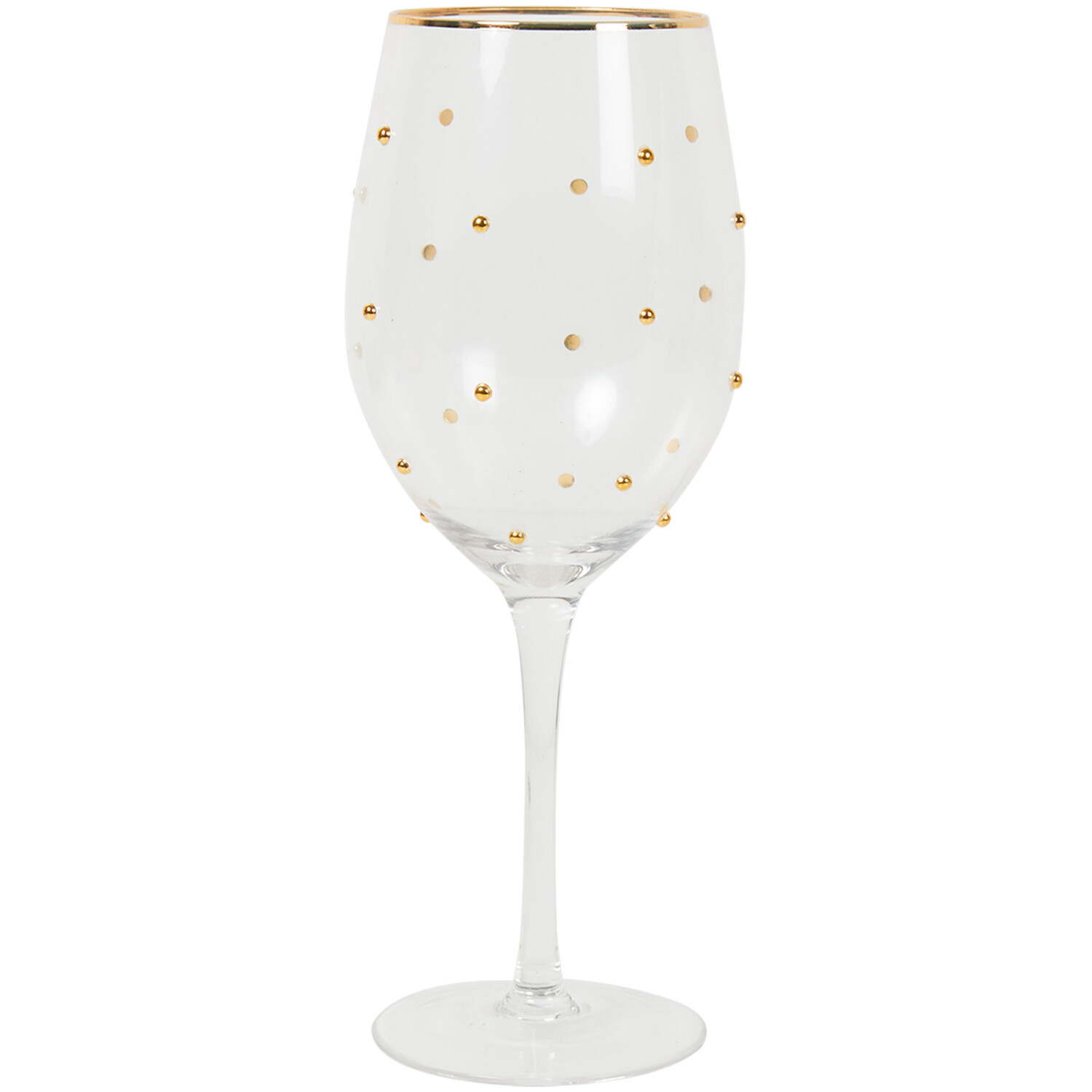 Enhance your dining experience with the Gold Decor Wine Glass with Gold Rim 560ml. This elegant wine glass features a long stem that allows easy swirling of your drinks. It includes a unique pattern with golden beads and painted dots, replicating a polka dot pattern. The wine glass has an elegant golden rim finish and holds up to 560ml.