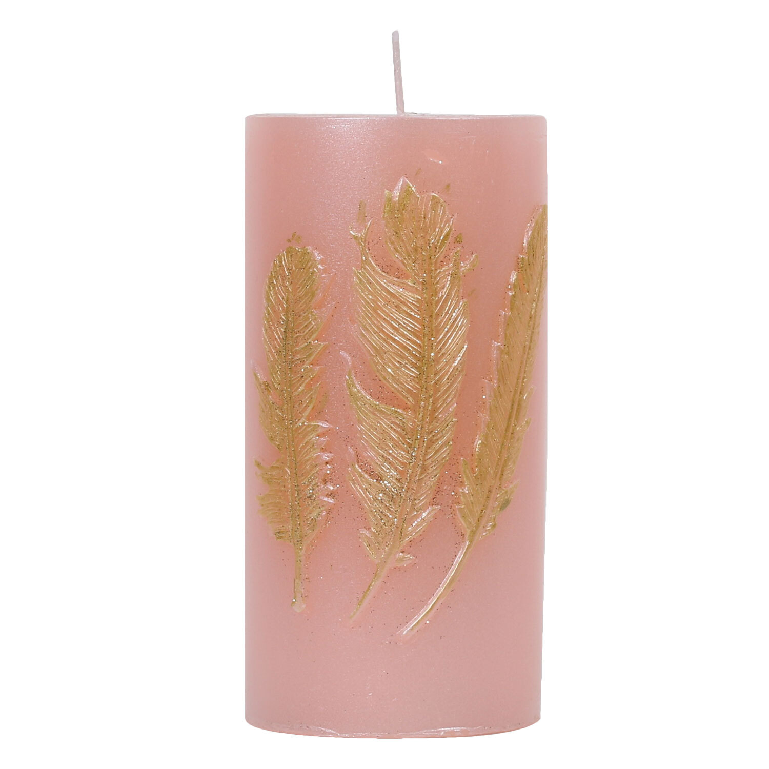 Give your home a warm and cosy atmosphere with this beautiful Gold Feather Pillar Candle. This attractive home accessory has a gorgeous blush pink tone and has been embossed with elegant golden feathers to give your space a more sophisticated touch. Ideal for using on candle plates or in hurricanes, this pillar candle is sure to bring warmth and style to your home.