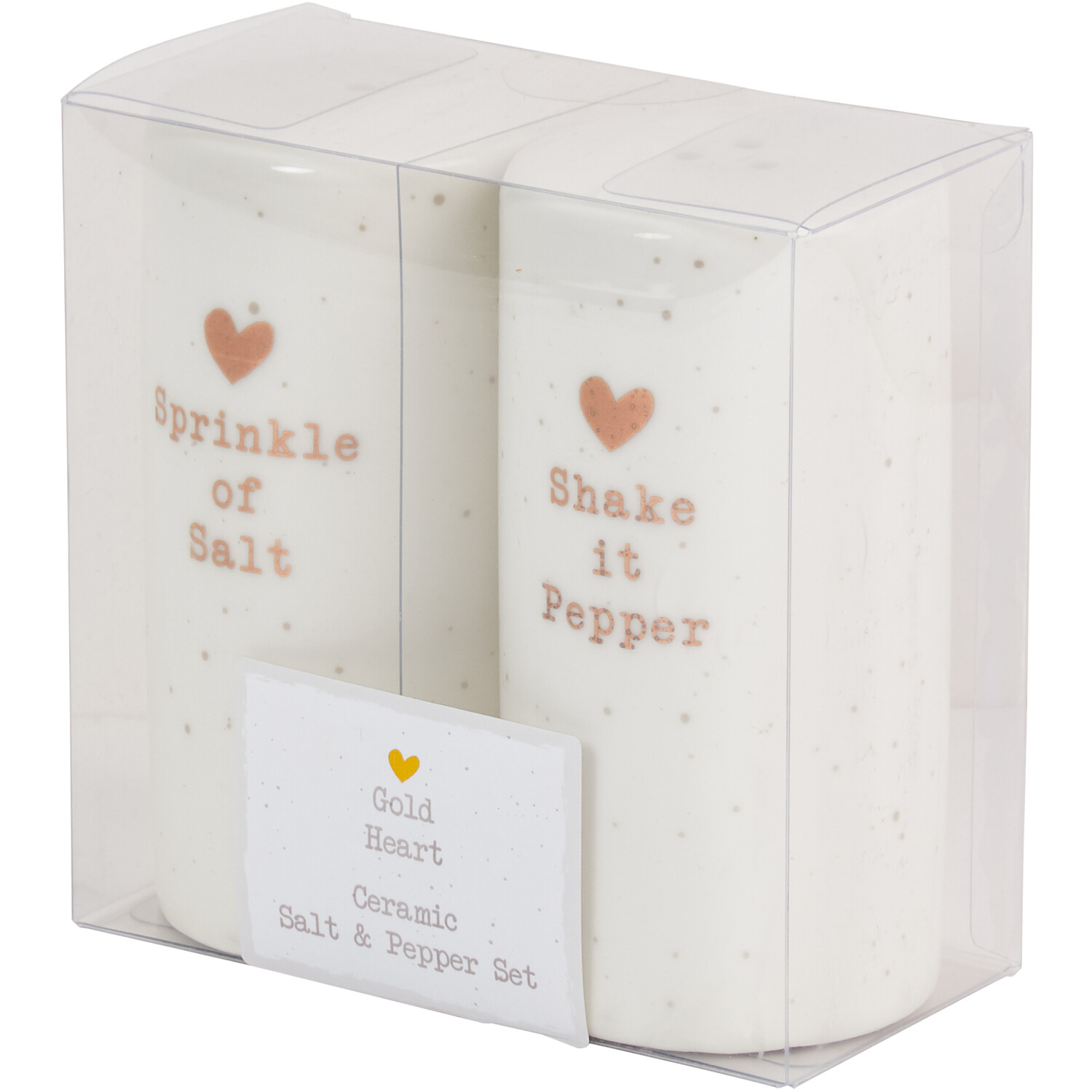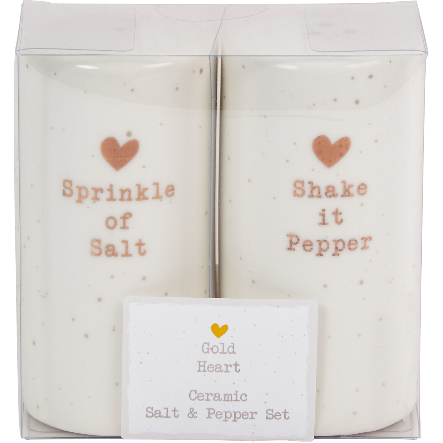 Elevate your dining experience with this Gold Heart Salt and Pepper Shaker Set. Featuring a sleek and stylish design, this set will make a perfect addition to your dinner tables. Besides a grey speckle splash, the set comes with a 'Sprinkle of Salt' and 'Shake it Pepper' text with gold foil hearts to elevate its overall design. Part of the Gold Heart collection, match them with coordinating kitchenware to make a complete set.
