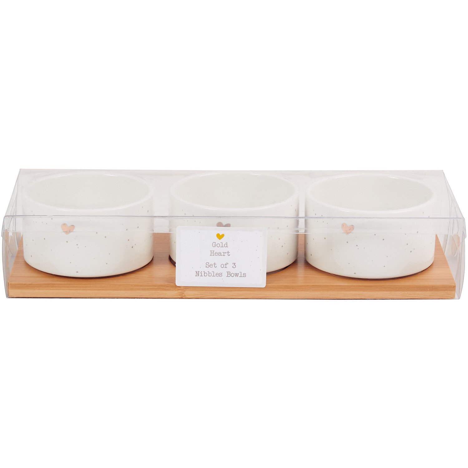 Elevate your table setting with this Set of 3 Gold Heart Nibble Bowls with Board. These bowls are the ultimate serving solution for your gatherings, parties, and other special occasions. They come on a beautifully crafted bamboo board with designated slots to place the three ceramic nibble bowls. For added style and texture, the bowls come in a stylish grey speckle splash finish and a gold foil heart. You can use each bowl to serve nuts, olives, dips, sauces and more. Part of the Gold Heart collection, you can match it with coordinating items to complete your tableware.