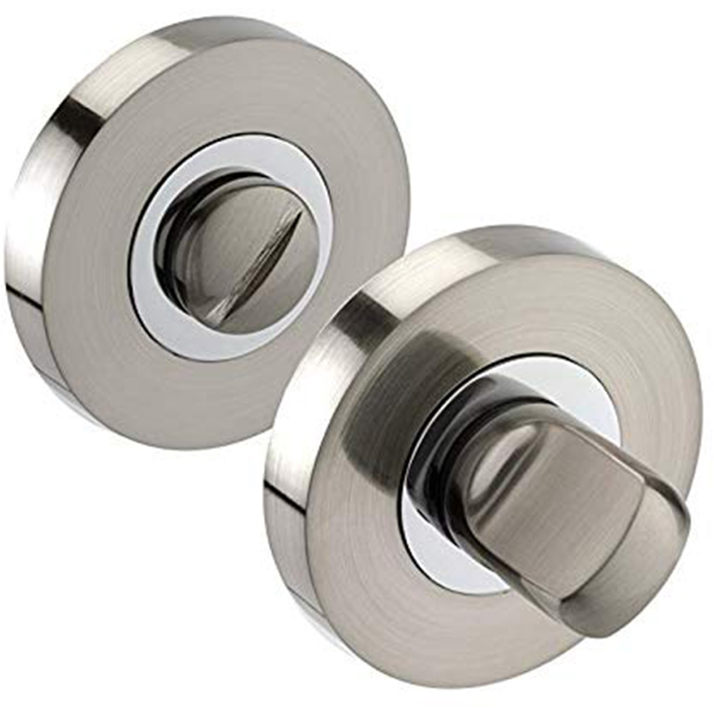 Upgrade your bathroom door with the Golden Grace Toilet Door Thumb Twist in a sleek duo chrome and satin nickel finish. This stylish turn and release set features a polished chrome inner ring and a satin nickel outer ring, perfectly complementing Golden Grace handles. Designed with a 50mm concealed rose, it offers a clean and modern look. The set comes with screws for easy installation and is compatible with most bathroom dead bolts or mortise locks (not included). Ideal for WC or bathroom doors in contemporary interiors.
