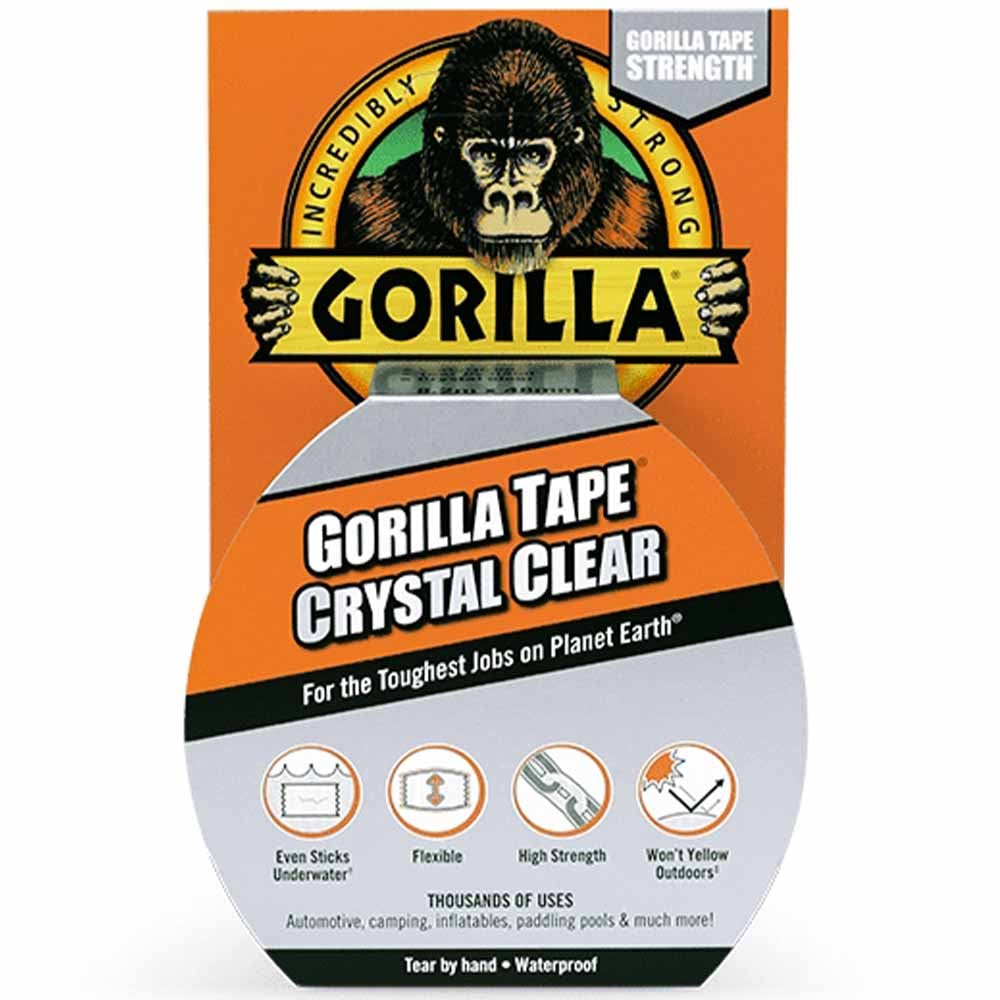 Gorilla Tape Crystal Clear is incredibly strong and perfect for virtually invisible repairs. The tough tape that combines high strength with ultimate clarity. This tape forms a flexible, airtight seal, indoors and out – it even sticks underwater!* Hand tearable with an ultra-strong adhesive layer, Gorilla Tape Crystal Clear is perfect for professionals, DIY, crafting and everyday uses. You can seal paddling pools, repair camping equipment, phone screens and more!