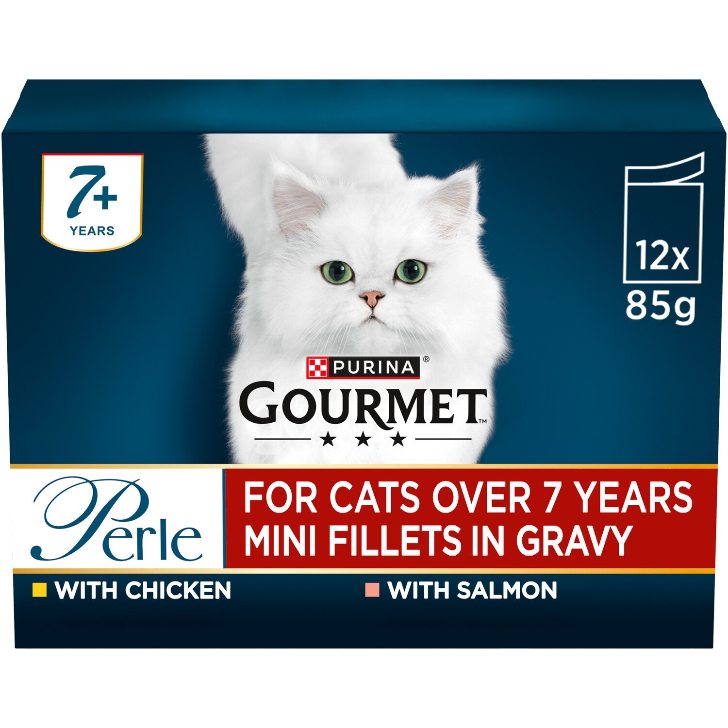Give your senior feline friend a gourmet dining experience with the Gourmet Perle 7 Plus Chef's Collection Pouches. Specially made for cats over seven years old, it features tender mini fillets in a rich gravy, with chicken and salmon for a satisfying meal. Packed with essential proteins and vitamins, it provides the nutrition your cat needs while delighting their taste buds.