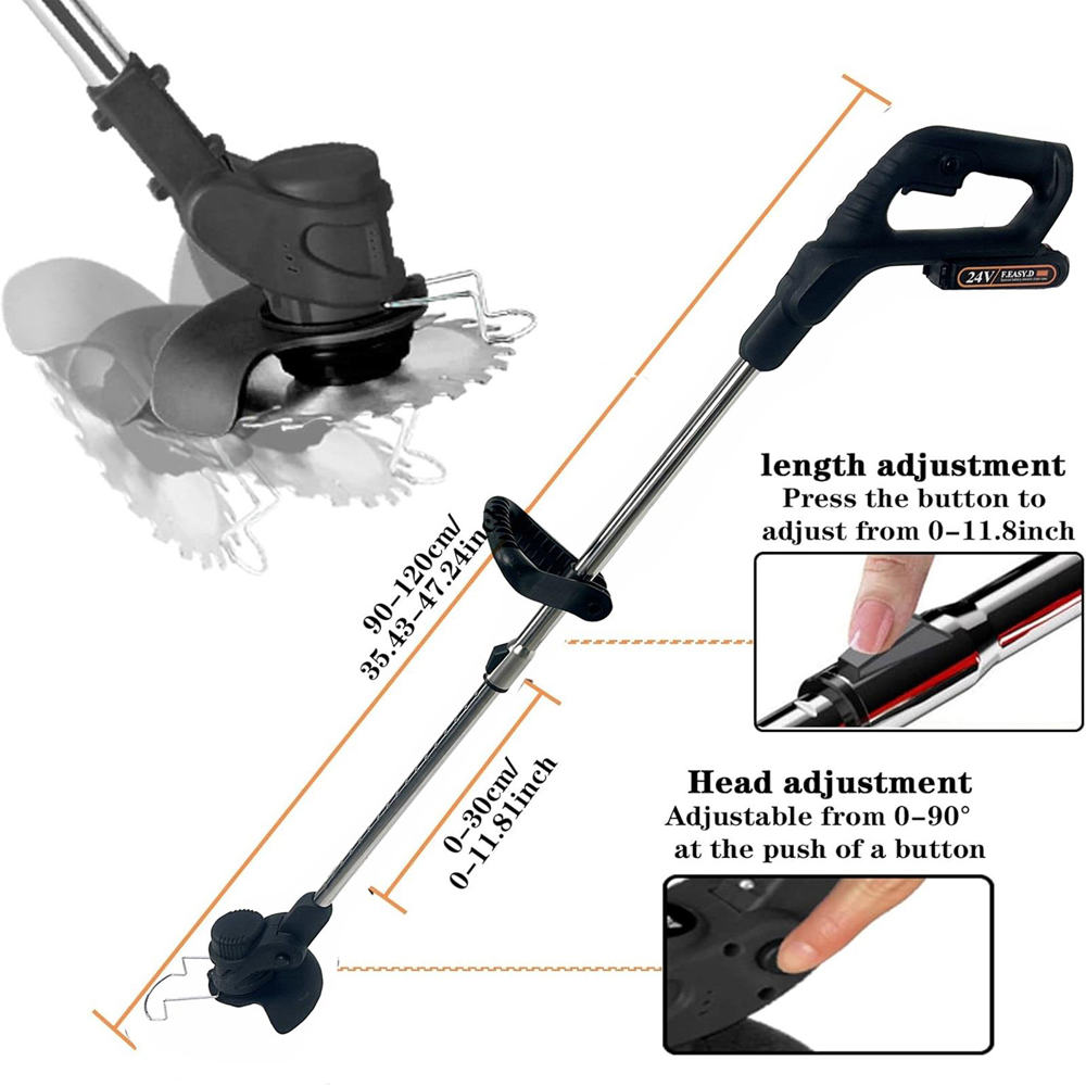 Say goodbye to tangled cables and extension cords with the Gr8 Garden 24V Cordless Electric Grass Trimmer. This portable and compact grass trimmer allows you to trim your entire garden effortlessly. Equipped with various blades for weeding and mowing, it ensures no damage to the turf and is perfect for cutting weeds, trimming branches, and tidying up yards and gardens. The adjustable pole can be freely adjusted to suit your needs, making it easy to reach all lawn edges, whether sloped or in narrow spaces. With an 800W power output and a no-load speed of 18,000 rpm, this efficient and reliable tool keeps lawns, paths, and flower beds clean. The 6000 mAh lithium-ion battery provides 30 to 60 minutes of usage time. The cutting head is 90-degree adjustable, and the one-key telescopic pole can be adjusted from 90 to 120 cm, allowing everyone to comfortably trim their lawn. Accessories include a grass strimmer, a battery, a charger, a saw blade, two rhombus alloy blades, and five nylon blades.