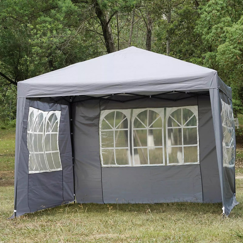 The premium gazebo provides a shaded area of 3 x 3 square meters, which is perfect for family gatherings, picnics, parties, outdoor activities, camping, commercial use, etc. Size: 3 x 3 x 2.5 metres, Material: 210D Oxford Roof silver coated, 210D Oxford Side Walls, PA Water Resistant coated, 3 Removable side panels with windows + 1 Removable side panel with zips as entrance, telescopic legs, Package contents - 1 x folding pavilion, 4 side panels, 8 pegs, 4 x ropes, 1 carrying bag and 1 set of assembly instructions.
