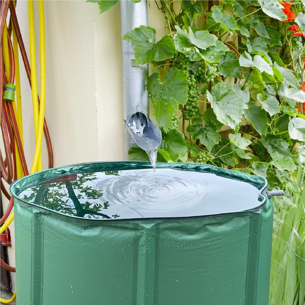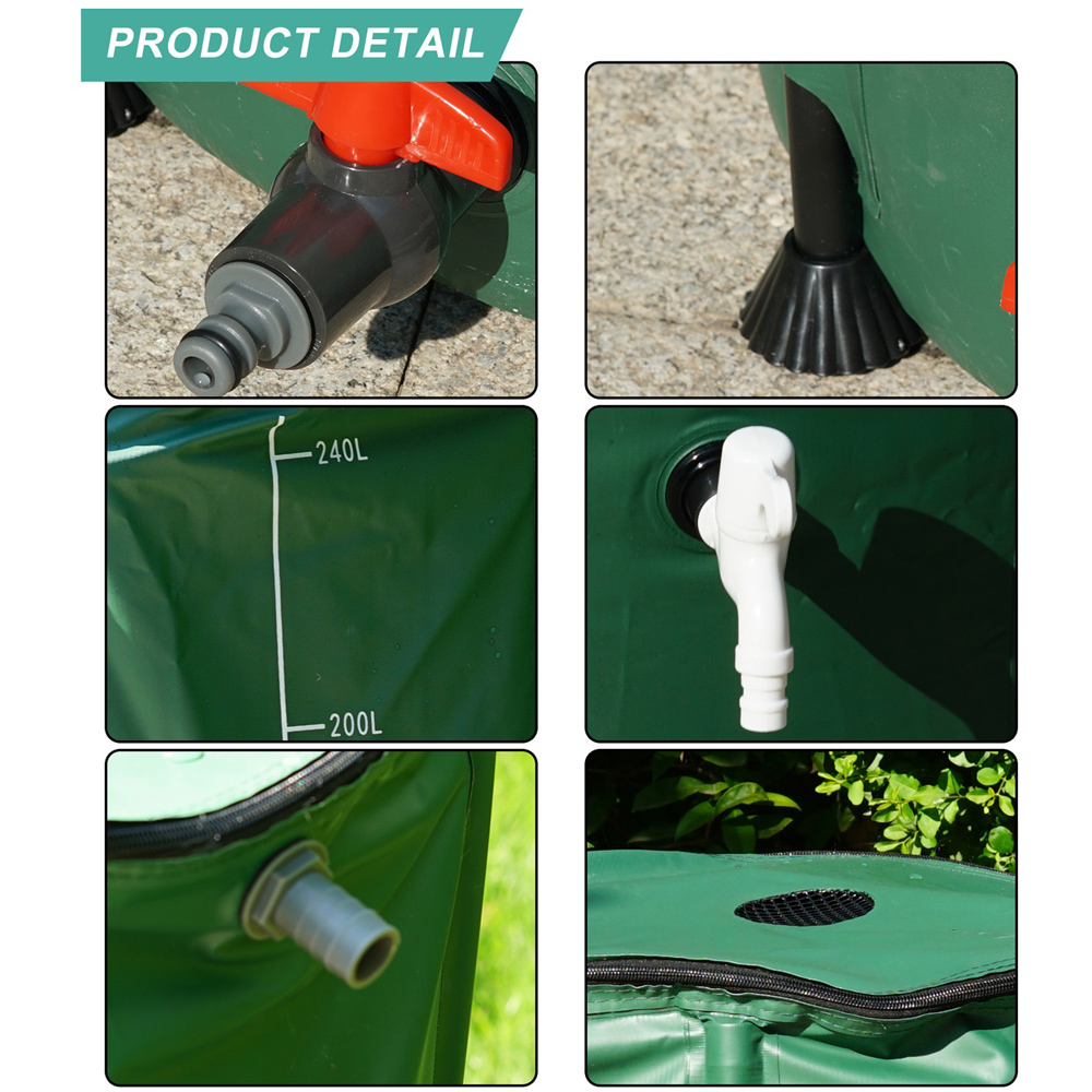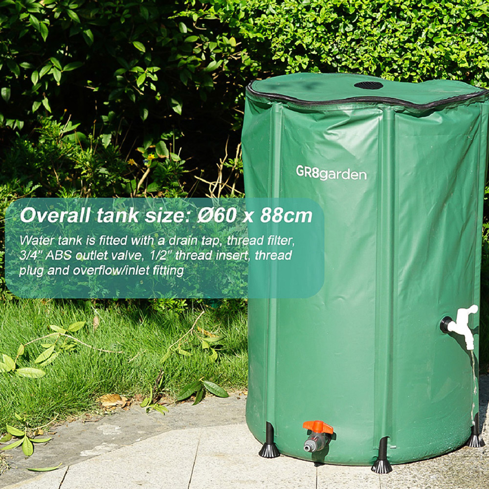 Gr8 Garden 250 Litre Collapsible PVC Garden Water Butt Portable Compact Tank Fold Up Storage Camping Barrel Collector with Zipped Lid & Drain Tap. 250L water barrel for collecting rainwater from a rooftop gutter saving you on your water bill for your garden. Folds flat into a compact size when not in use making it cost-effective for both shipping and storage. Easy to transport, and also fit into spaces and through doorways that rigid designs will not. No tools are needed. Each barrel includes six standing poles, fitted with adjustable feet to provide good stability. A zipped lid fitted at the top to keep the water clean after collection. 250L Collapsible PVC Garden Water Butt with Zipped Lid & Drain Tap, Overall tank size: Diameter 60 x 88cm, 250L water barrel for collecting rainwater from a rooftop gutter saving you on your water bill for your garden. The water tank is fitted with a drain tap, thread filter, 3/4" ABS outlet valve, 1/2" thread insert, thread plug and overflow/inlet fitting. Lid collection filter: Diameter 75mm. No tools are needed. A zipped lid is fitted at the top to keep the water clean after collection. Each barrel includes six standing poles, fitted with adjustable feet to provide good stability. Folds flat into a compact size when not in use making it cost-effective for both shipping and storage. Easy to transport, and also fit into spaces and through doorways that rigid designs will not.