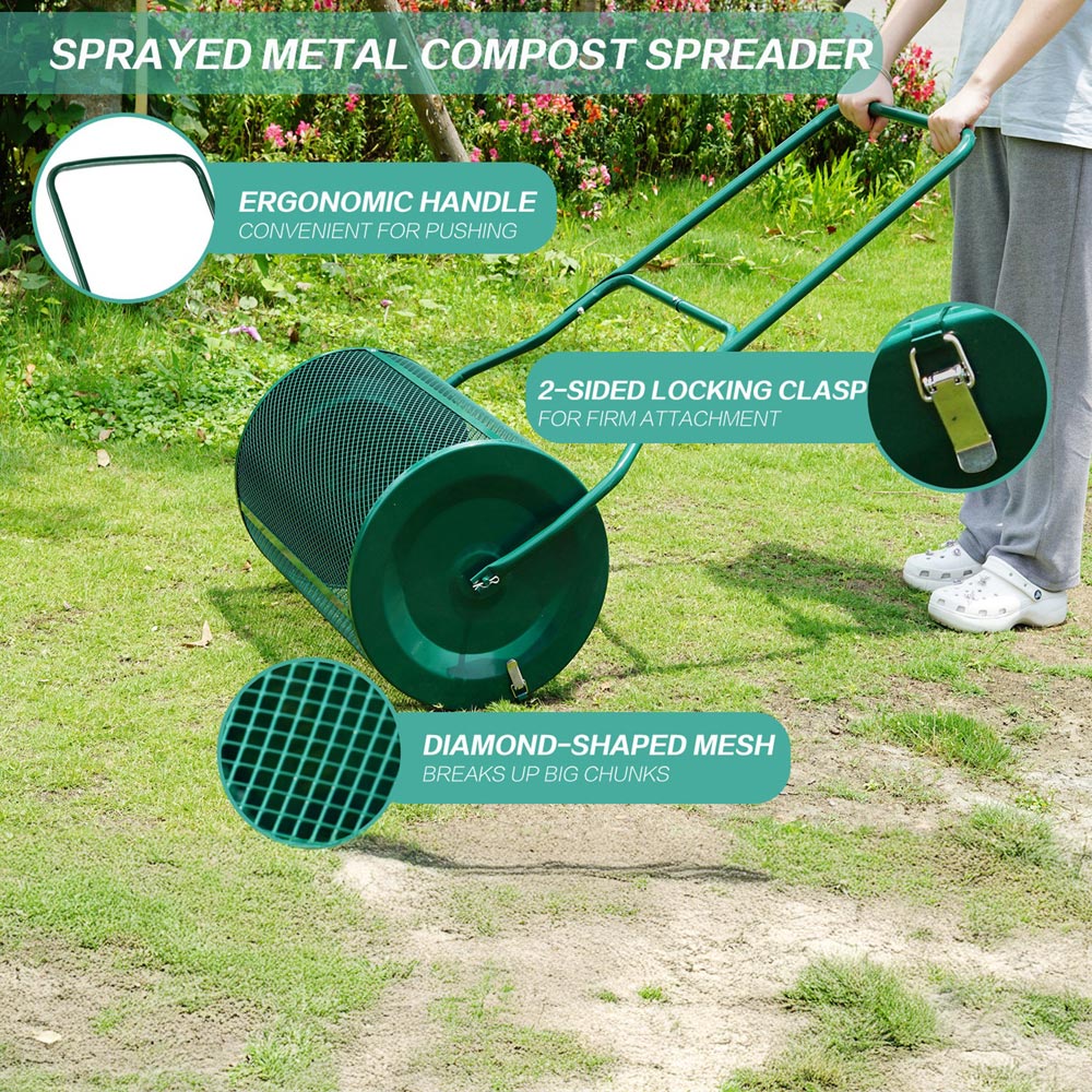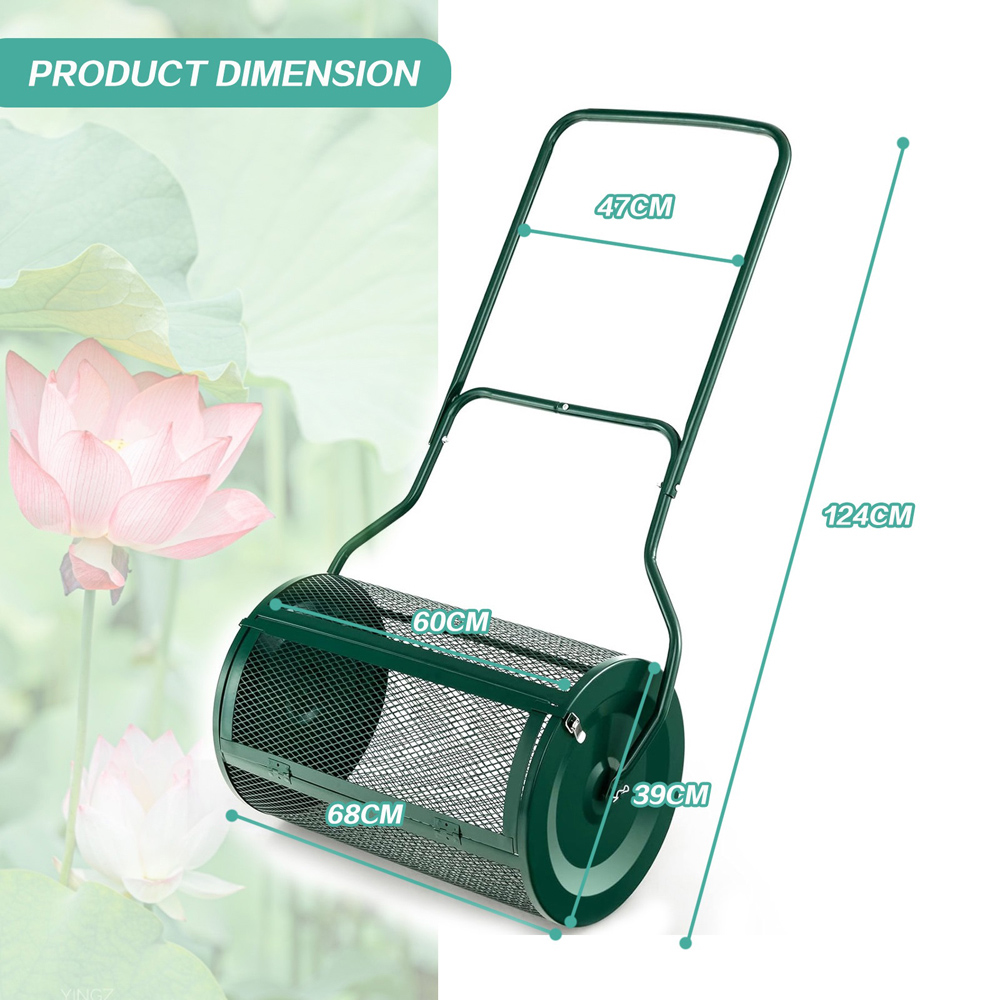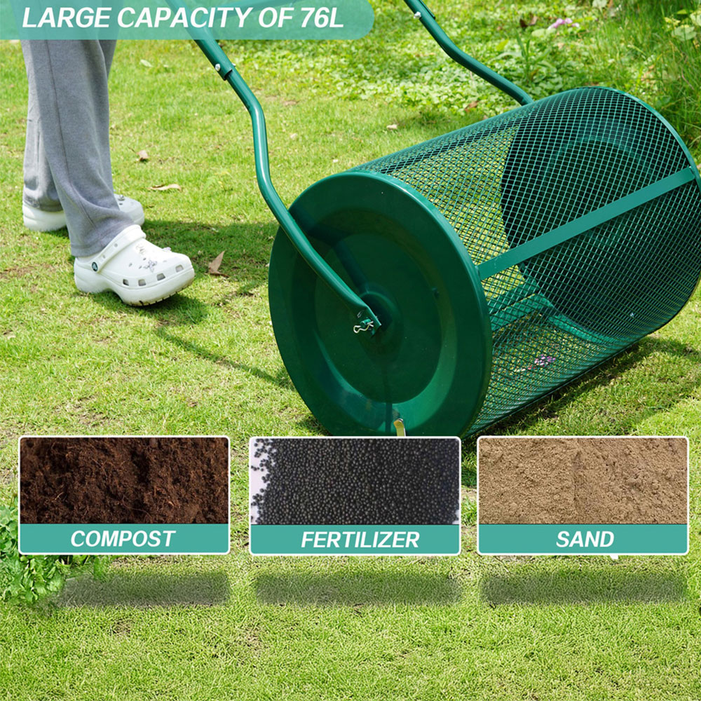 Gr8 Garden 76 Litre Heavy Duty Metal Garden Grass Lawn Compost Spreader Manure Peat Moss Sand Roller Top Soil Fertiliser Rolling Barrel Drum Frame. Gr8 Garden Lawn Composting Roller Spreader evenly distributes organic materials over lawns, including compost, topsoil, peat moss, fertilizer, sand, and more. The rolling spreader is easy and efficient to use, the mesh basket breaks up large chunks and promotes even spreading. Perfect for top-dressing your lawn and helping to hide imperfections. With a large holding capacity roller size of 76L, it can hold a large amount of your chosen material meaning less refilling. Made of durable and robust metal it is versatile for use on a variety of surfaces without causing damage. 76L Garden Compost Spreader, Size: 124cm x 68cm x 39cm Approx, 76L capacity, 68cm spread width, Lawn spreader is designed with intensive diamond-shaped mesh, Breaks up large chunks, leaving behind any large unwanted residual in the drum for disposal. The 2-sided locking clasp ensures firm attachment to avoid the leakage of fertilizer during rolling. Made of solid metal, it is durable and resistant to deformation.