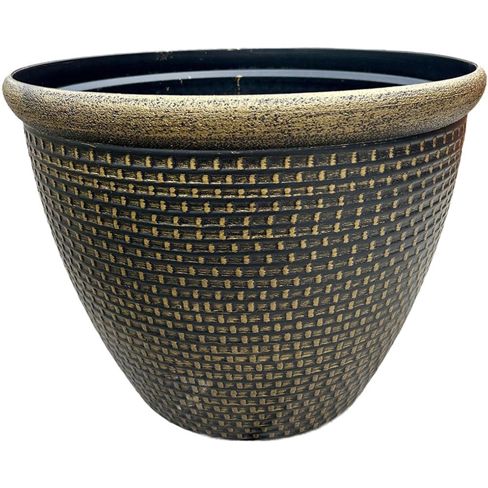 Enhance your garden or home decor with the Gr8 Garden Large 36cm Plastic Round Cromarty Plant Pot. Combining classic design with eco-friendly recycled materials, this robust planter offers a lightweight alternative to heavy clay or ceramic pots. Its distinctive brick pattern and stone effect design make it a standout feature wherever placed. Made from PP plastic, it measures 36cm in diameter at the top, 20cm at the bottom, and 29cm in height. The set of two pots includes drainage holes and boasts lightweight, weather-resistant, and rust-resistant properties. Colour: Gold.