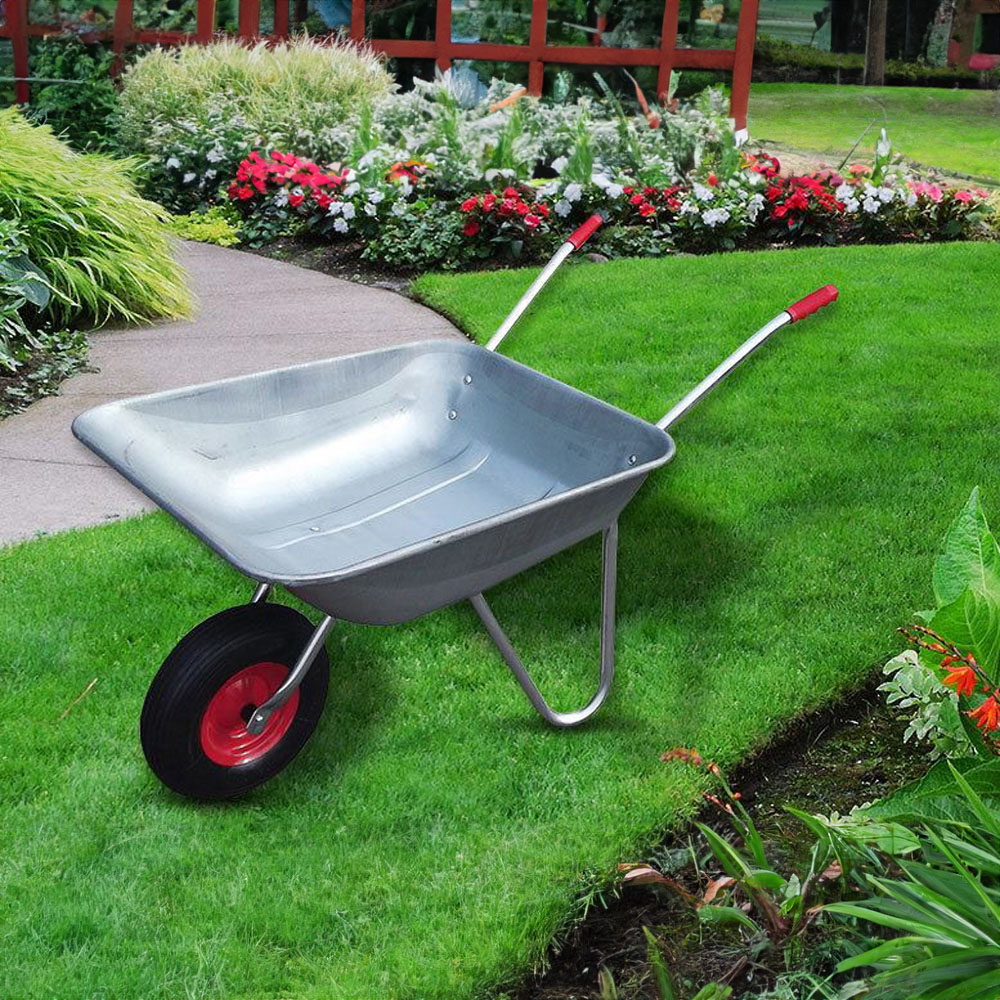 Make your gardening tasks a breeze this summer with the Gr8 Garden Heavy Duty Galvanised Wheelbarrow 65L. Crafted from durable galvanised steel, this robust wheelbarrow is designed to withstand the unpredictable British weather. With a generous 65L capacity and a maximum weight limit of 80kg, it allows you to transport heavy items effortlessly across your garden. Ideal for both garden and DIY jobs, the large bucket is perfect for carrying light waste, debris, and rubble. The pneumatic (air-filled) wheel ensures stability and easy manoeuvrability over various terrains, while the sturdy support frames and soft rubber handles provide comfort and ease of use. Measuring approximately 130cm in length, 60cm in width, and 60cm in height, this wheelbarrow requires simple assembly and is an essential tool for any gardening enthusiast.