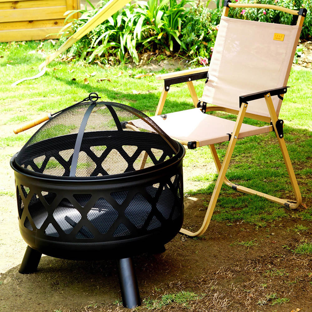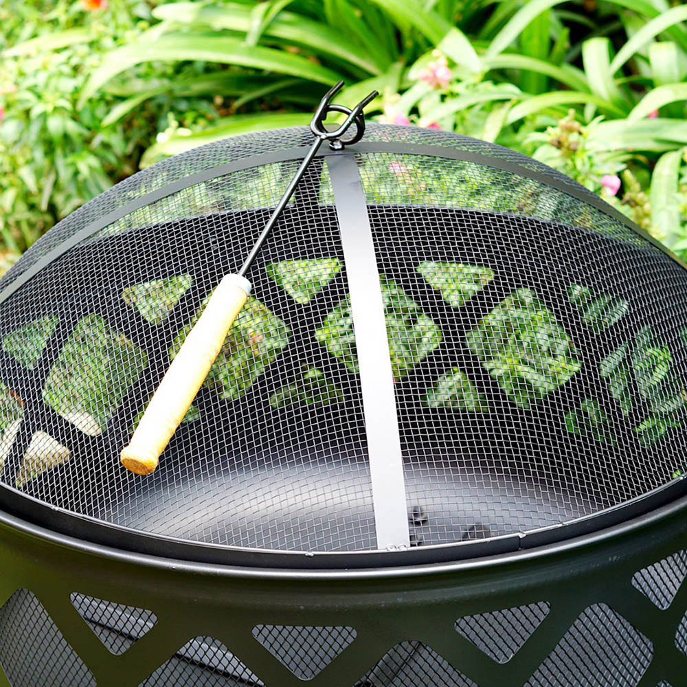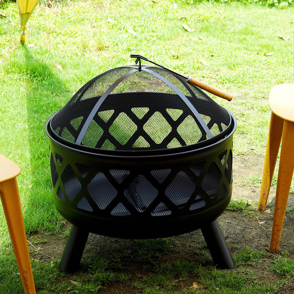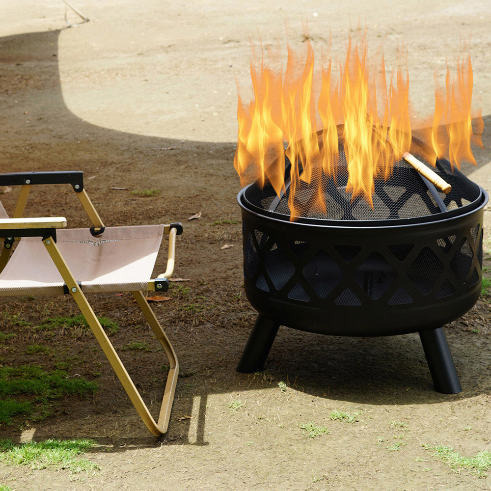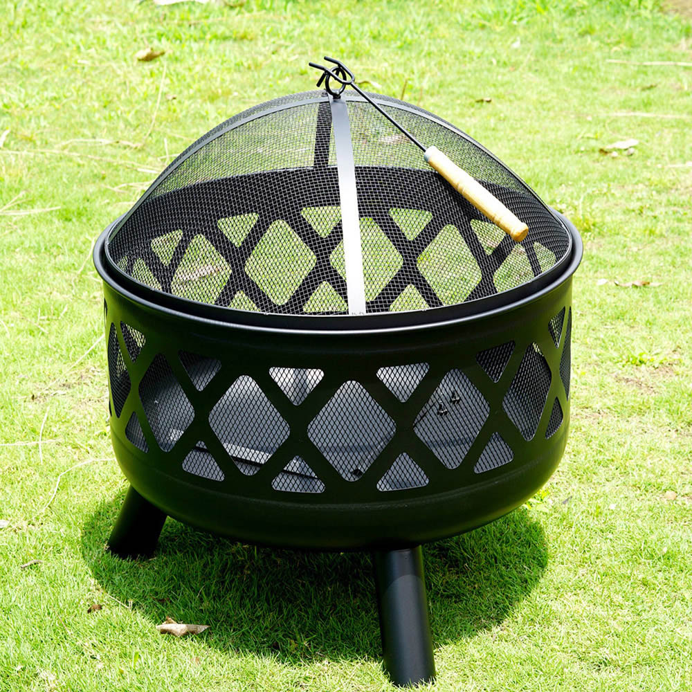 Gr8 Garden Round Fire Pit Bowl Black 24-inch Large Outdoor Garden Patio Mesh Cover And Poker Camping Wood Log Heater Steel Charcoal Burner. This eye-catching and compact deep round fire pit with a Black Diamond design is the perfect addition to your garden to keep you warm during those long summer evenings. The Gr8 Garden 24" Deep Round Fire Pit will enable you to get the most out of your garden while creating a stunning feature for your guests to gather around. Ideal for use as a centrepiece for your patio; simply fill the deep pit with logs or charcoal to create a warm, inviting environment to socialise with friends and family. The mesh cover prevents any spitting embers from escaping and the metal poker provided lets you keep the fire burning safely when moving the materials in your fire pit around. 24 Inch Large Round Outdoor Fire Pit, Material: Steel, Dia.: 61cm Diameter x H 58cm Approx, Fire Bowl size: 61cm Diameter H 30cm Approx, Material: Fire Bowl coated with black 600? Heat-resistant paint, The Wooden bar easily burns the fire. Mesh cover coated with black 400, heat resistant paint, Including the Handle poker and cooking grill Not included.