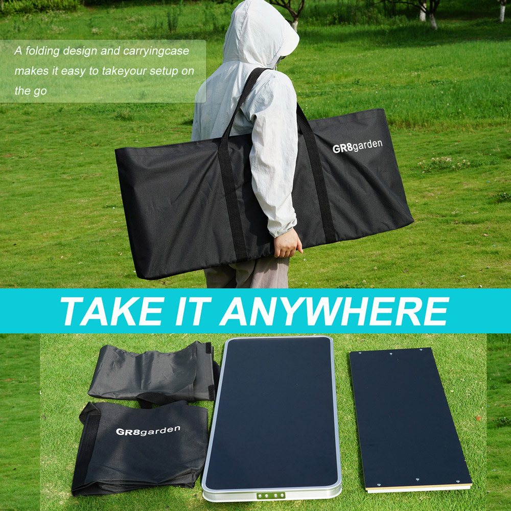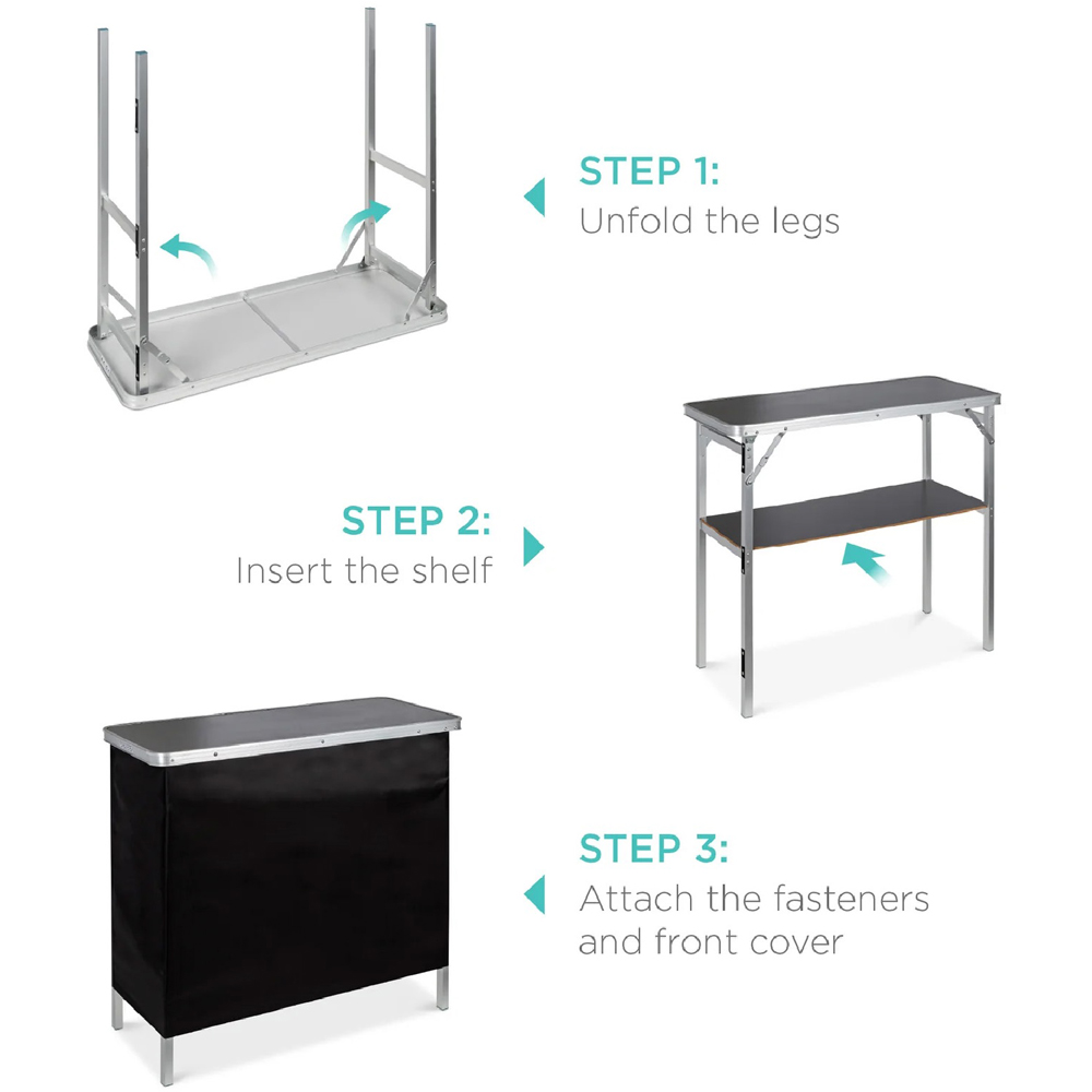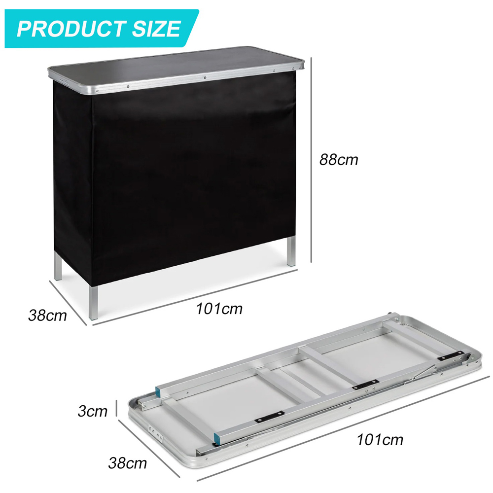 Gr8 Garden Patio Portable Folding Bistro Bar Table Compact Indoor Outdoor Camping BBQ Kitchen Poolside Foldable Serving Desk with Carrying Bag Case And Removable Skirt. Suitable for outdoor or indoor use, such as camping, picnic table, grill table, bedside table, study table, and dining table - It is big enough for almost any project, yet doesn't take up much space, Portable Folding Bar Table w/ Carrying Case, Removable Skirt, Product size: 101x88x38cm, Folding size: 101 x38x3cm, Maximum Weight Recommendation: 50KGS, Top Material Type: Aluminium + MDF Board + Oxford Cloth, Premium Durability: Our versatile, foldable portable bar table is built with sturdy aluminium alloy and MDF board to handle your long-term display needs. With a top supporting up to (50 kg) and a second-tier partition holding (30 kg), it's a reliable workhorse for your displays. Multifunctional Design: This exhibition counter stand is your all-in-one solution for various occasions, from trade shows and conferences to teaching and family gatherings. Use it as a showcase, podium, or temporary workstation. Let your creativity run wild! Includes Polyester Cloth: As an added gift, the portable tradeshow podium comes with a versatile polyester cloth that pairs seamlessly with the Velcro. It lets you create eye-catching backgrounds, elevating the professionalism and aesthetics of your displays. Whether as a tablecloth, backdrop, or cover, it's easy to clean and built to last.