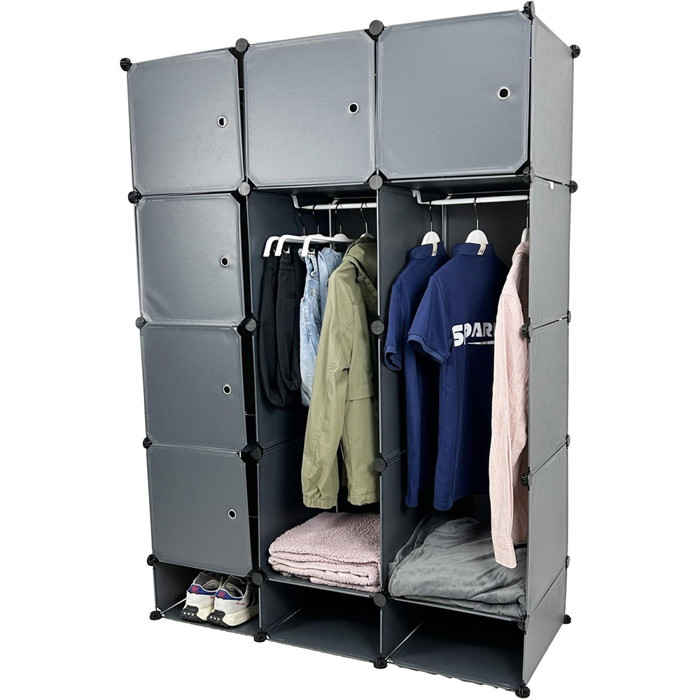 Gr8 Home 15 Cube Grey Wardrobe Portable Interlocking Plastic Modular Closet Storage Organiser Cabinet. Organise and store your clothes with this innovative DIY wardrobe from Gr8 Home. Made from sturdy and hard wearing plastic and easy to assemble and disassemble. Size: 45*111*165cm, The upper 12 cubes provide ample space for storing and sorting seasonal clothes or daily accessories in dust-free area. Each door is translucent, with magnetic suction and ring hole design, you can see the items inside, and it is easy to open. The lower 3 open shelves are great for keeping shoes stored in good ventilation and with easy access. Made of high quality, safe PP material, all these storage cubes are tightly jointed together by ABS connectors to integrate a stable construction that offers a high load-bearing capacity. The cube closet boasts reliable stability and durability for daily essentials, with each cube bearing weight up to 10kg. No more struggling with multiple screws, assemble this DIY interlocking combination armoire will be much easier and effortless in a short time. Simply connect the panels together with connectors to form a compact closet wardrobe. Plus, the waterproof PP surface is very easy to clean up with a damp cloth.