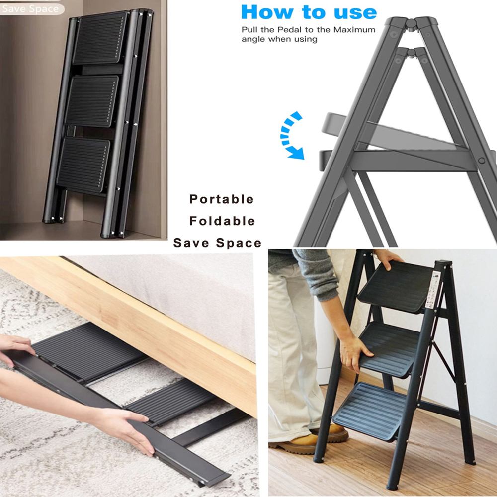 Gr8 Home Black Portable Step Ladder Foldable Stool Non Slip Tread Heavy Duty Metal Carbon Steel Compact Lightweight Folding Home DIY Kitchen Aid. The ladder folds down for easy storage and convenient transportation, making this item the perfect ladder for every kind of DIY job such as decorating, painting and reaching to those hard to get places. Heavy Duty Steel 3 Step Folding Ladder, Size of 3 Step Ladder 42x 63x 84cm, Material: Carton steel, Colour Black, Maximum Load: 120 kg, The step ladder comes with European EN14183 certificate, Slip Resistant Design: Sturdy and wide pedals of kitchen ladder with anti-slip texture. Big rubber feet of step ladder 3 step folding fully touch the ground to stay firmly and prevent floors from scratching.