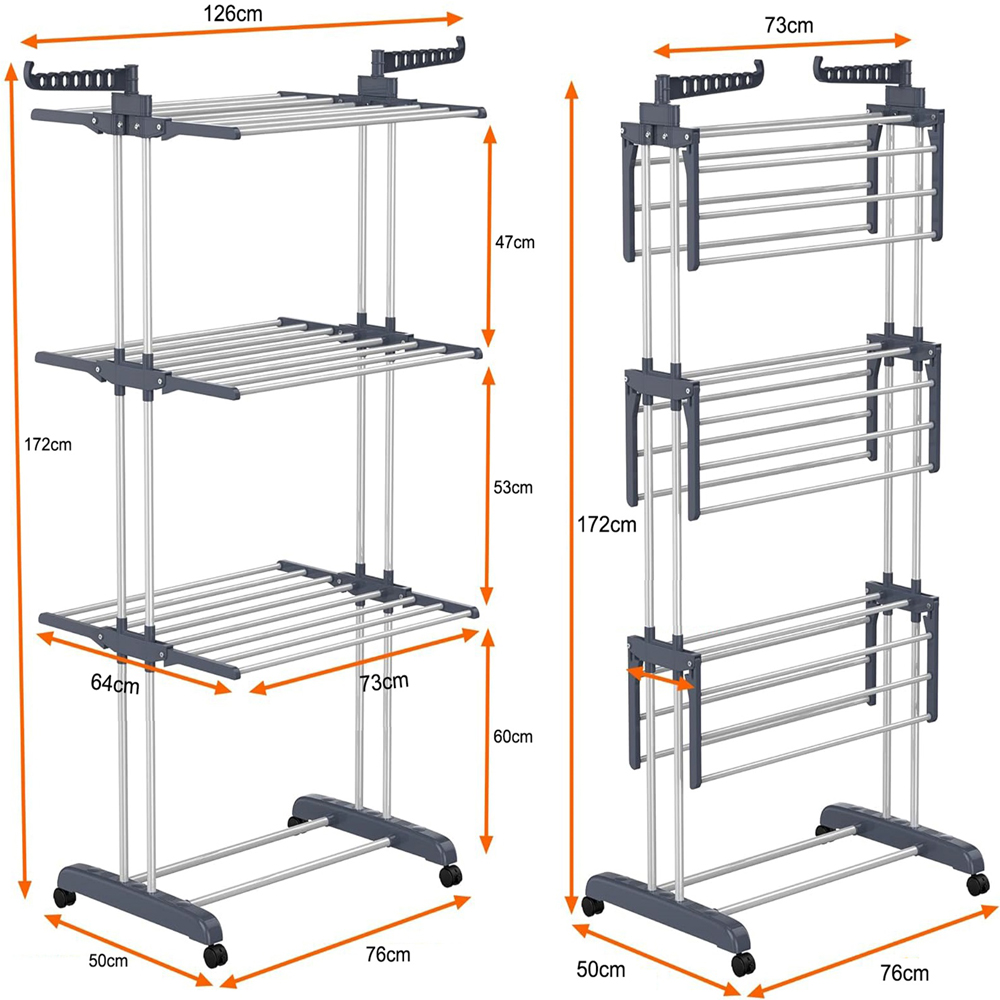 Gr8 Home Large 3 Tier XL Tower Folding Airer Clothes Drying Horse Rack Dryer Washing Dry Laundry Compact Foldable Stand. This three-tier airer is the perfect solution for smaller living spaces or students heading to university without access to a dryer. It’s particularly useful during the winter months when outdoor washing lines aren’t an option or when you lack outdoor space. This is an effective method for drying your clothes and can be easily relocated throughout your home, whether in the utility room or your bedroom. The Gr8 Home drying rack provides 18 meters of drying space and includes 14 hanging hooks. When the side wings are opened, it expands into three larger sections. This clothes horse caters to your drying requirements for various items. Product dimensions: 172H x 50W x 76Dcm.