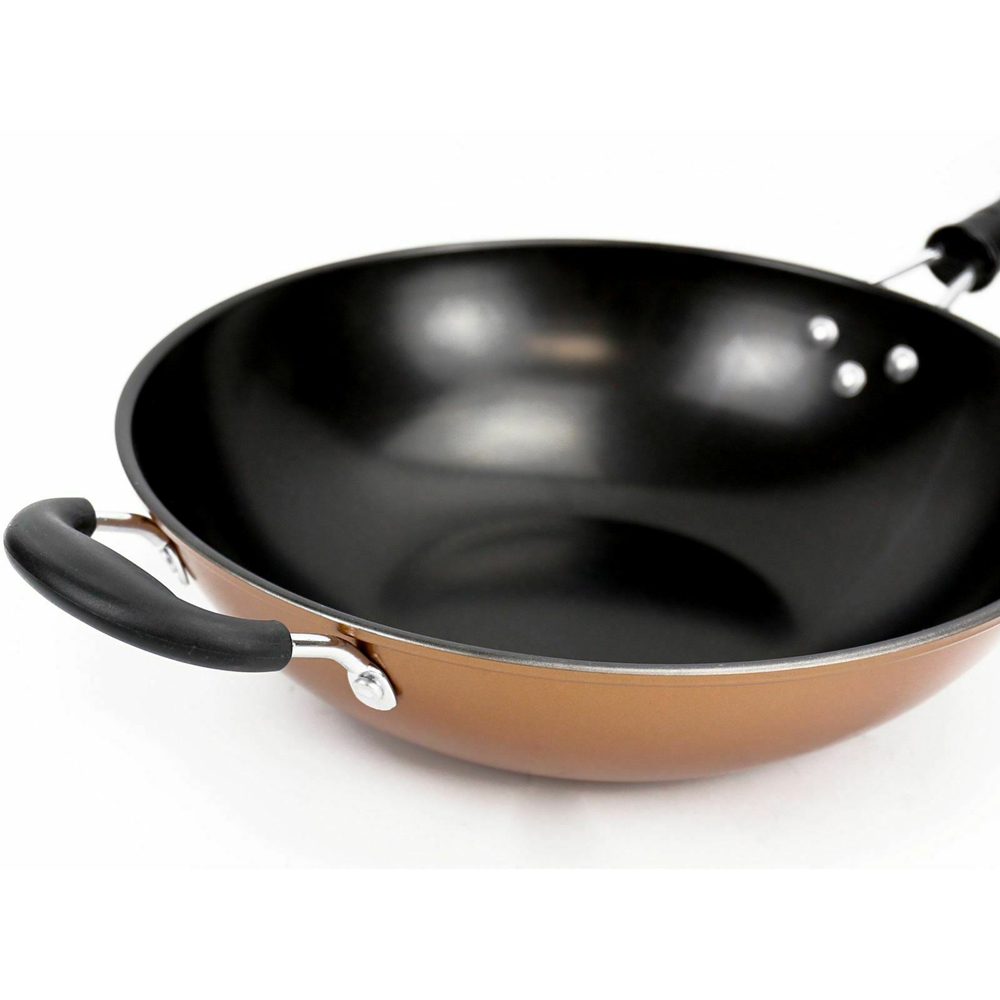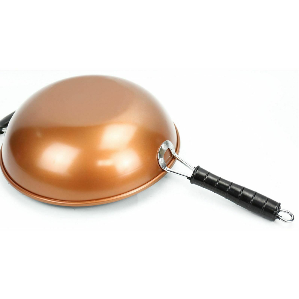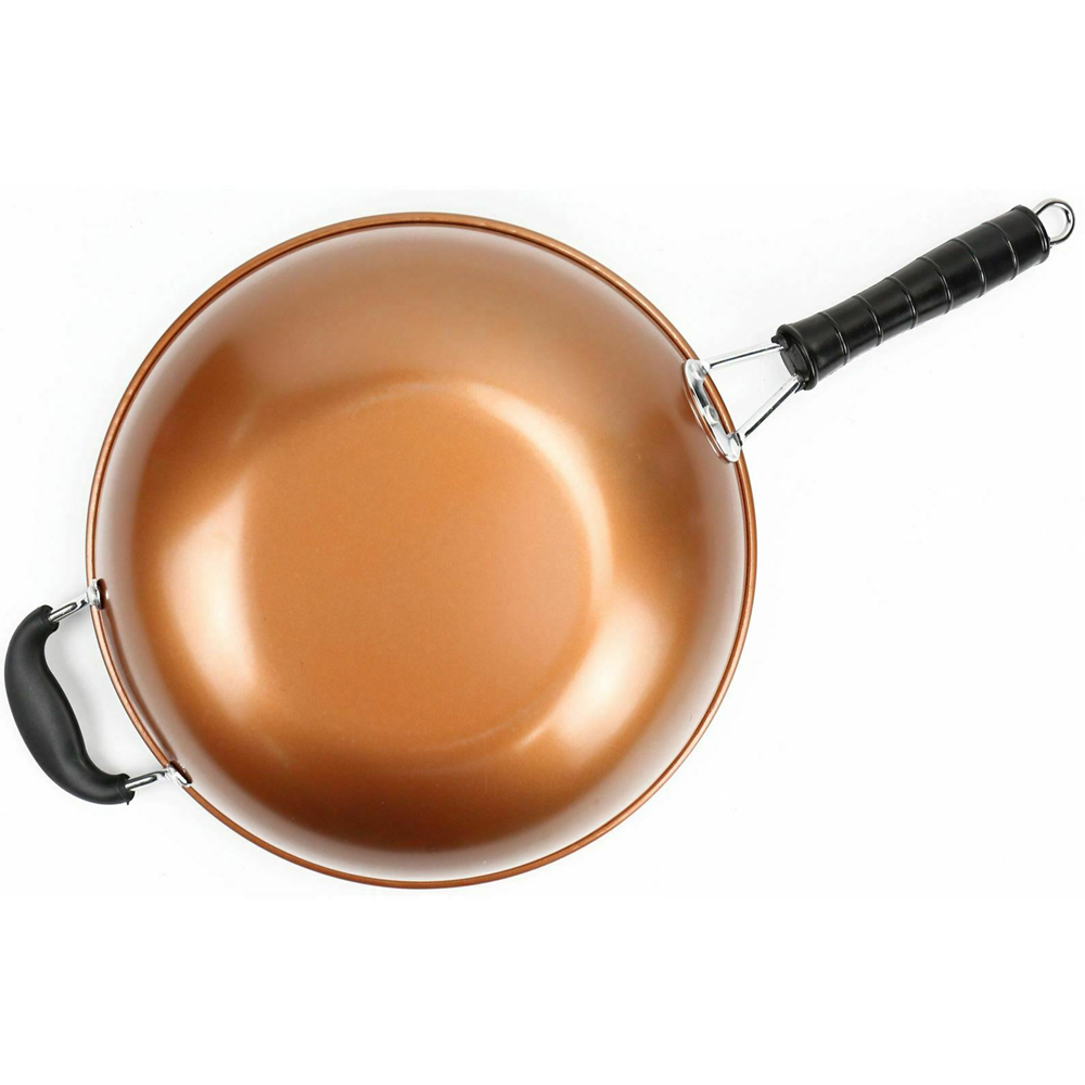 Gr8 Home Large 30cm Induction Copper Wok Non Stick Carbon Steel Frying Pan Stir Fry With Two Handles Kitchen Chinese Cooking Asian Cookware. This stylish copper style carbon steel wok has a non-stick coating and is the ideal pan for authentic Chinese cooking. The wok heats up evenly and quickly, withstanding the high temperatures needed for stir frying. It has a flat base for stability, a Bakelite handle for a cool grip, an additional helper handle and a handy hanging loop for convenient storage. Suitable for all hob types including induction. The big wok with helper handle, Easy clean non stick interior, High temperature coating exterior, Bakelite handle, Suitable for all heat surfaces below: Gas, Electric, Ceramic, Halogen, Induction, Made with durable carbon steel, Multi Use: Wok, Cook, Fry, Salute, Stir, Diameter: 30cm Approx, Height: 9cm Approx.