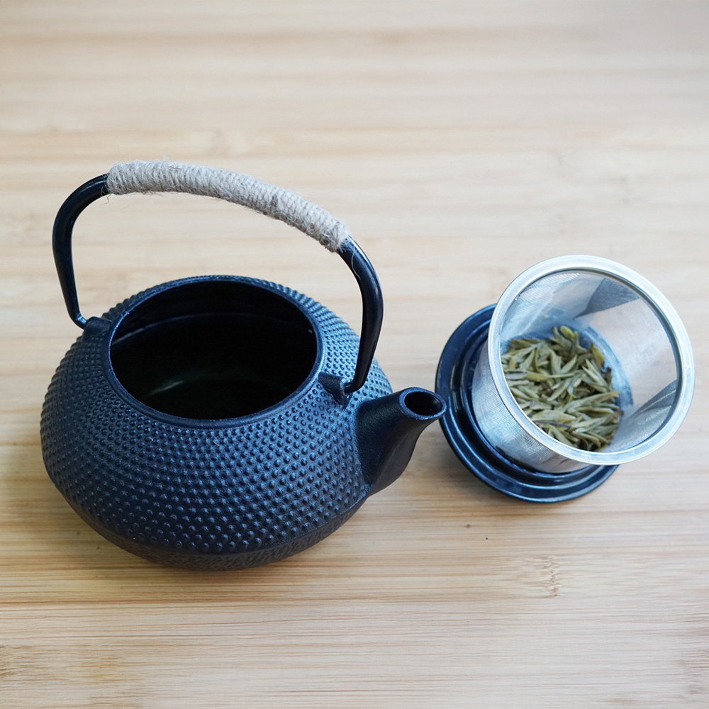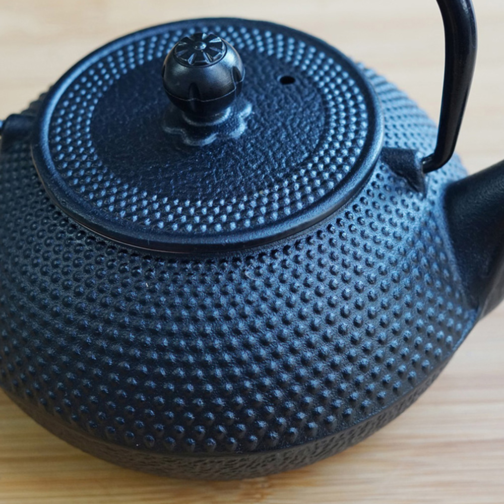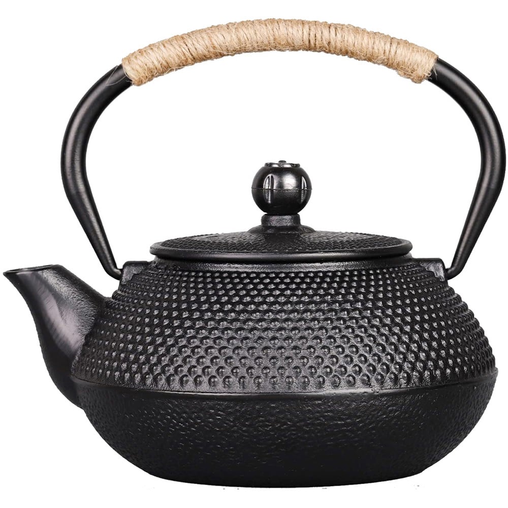 Gr8 Home Cast Iron Black Japanese Style Teapot with Infuser, 800ml 4 Cup Loose Leaf Tea Pot featuring a Mesh Strainer, is a Stovetop Tetsubin Tea Kettle adorned with a Hobnail Design. With its Japanese-inspired hobnail pattern, the Gr8 Home Tetsubin teapot will bring a charming touch to your kitchen, enhancing those essential tea moments. Thanks to its capability to retain heat, this cast iron teapot is ideal for brewing large quantities of tea, ensuring your cup of joy stays warm for an extended period. You can either utilise the stainless steel mesh infuser for loose leaf tea, take out the infuser for tea bags, or use it simply as a stovetop kettle to heat water. Featuring a rustic rope-like handle, you can brew according to your preference. Cast Iron Japanese Style Teapot, Material: Cast Iron, Capacity: 800 Millilitres, includes Stainless Steel Infuser, Colour: Black.