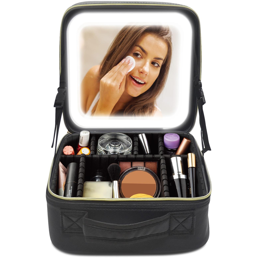 Gr8 Home Black Cosmetic Makeup Vanity Travel Case Portable Make Up Storage Beauty Box Bag Organiser with LED Light Up Mirror. Upgrade your makeup game with this Portable Makeup Bag featuring a built-in LED mirror, perfect for on-the-go touch-ups! This Travel Cosmetic Train Storage Case is designed to keep your beauty essentials organized while providing convenience and style wherever you go. Illuminate your beauty routine with the integrated LED mirror, ensuring flawless makeup application anytime, anywhere. Compact and lightweight, this makeup bag is ideal for travel, whether you're jet-setting across the globe or simply heading to the gym. Multiple compartments and pockets offer ample space to store your makeup brushes, cosmetics, skincare products, and more. Made from high-quality materials, this storage case is durable and built to withstand the rigors of travel. Sleek design with a touch of elegance, making it a stylish accessory for any makeup enthusiast. Lighted Cosmetic Case, Easy to Carry, Adjustable Divided Compartments, Removable Brush Holder, Multipurpose Beauty Storage Box, Product size: 27 x 23 x 12.5cm, Net weight: 750g, Material: PU, Battery: 1000 mAh, Working time: 1-2.5h, Includes USB cable.