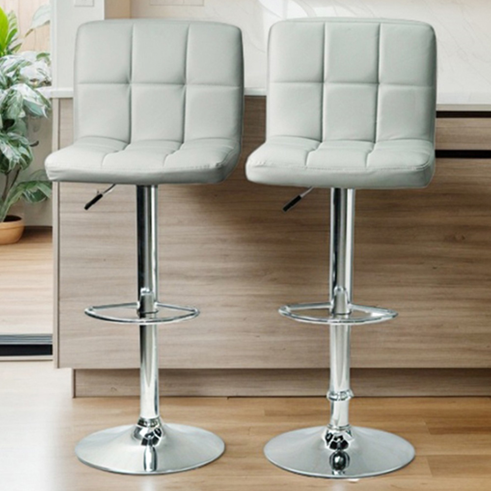 Gr8 Home Set Of 2 Light Grey Faux Leather Breakfast Bar Stool Swivel Kitchen Cafe Restaurant Dining Chrome Gas Lift Pair Of Seats. Kick back in your kitchen with this modern executive bar stool. Featuring a padded seat and back rest, it's comfy and supportive. Plus its PU leather-effect upholstery is easy to wipe clean. The adjustable gas-lift seat suits a range of heights and the chrome stand has a sleek, contemporary style. Featuring swivel functionality, it gives you extra flexibility to move around. Pair Of 2 Light Grey Faux Leather Swivel Breakfast Height Adjustable Bar Stool. Colour: Light Grey, Dimensions 380 x 410 x 950~1150mm 50mm, High Density Foam / Steel Base with Chrome Finish Swivel seat for easy sitting and standing, Gas lift for easy height adjustment Seat material: faux leather, strong chrome steel base and footrest, The barstools are ergonomic, with seats made of high-density foam and equipped with metal footrests. This design reduces pressure on your back and legs, helping to relax your muscles.