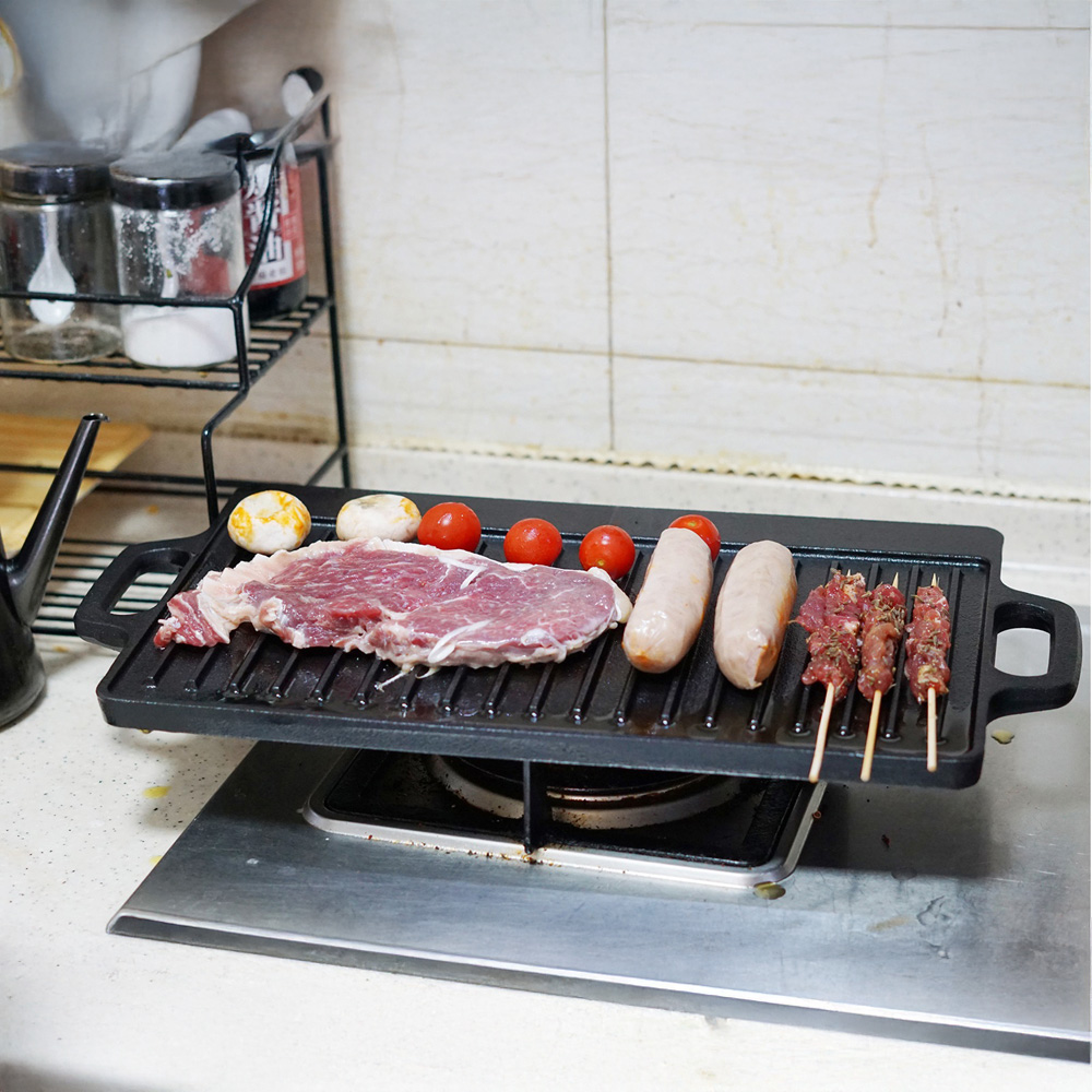 Gr8 Home Cast Iron Reversible Griddle Plate Pre-Seasoned Non-Stick BBQ Pan Oven Hot Plate Ribbed Skillet with Handles. Heavy duty cast iron construction for superior heat distribution and retention, as well as long-lasting performance. This reversible griddle has one ridged side and one flat, smooth side to expand the range of recipes you’re able to produce. Two large handles for easy handling, while non-stick coating prevents food and odour sticking. Hand wash only. Cast Iron Griddle Plate, Unit Size: L37.5*D22.7*H1.5cm, includes handle: L45cm, Material: Cast Iron